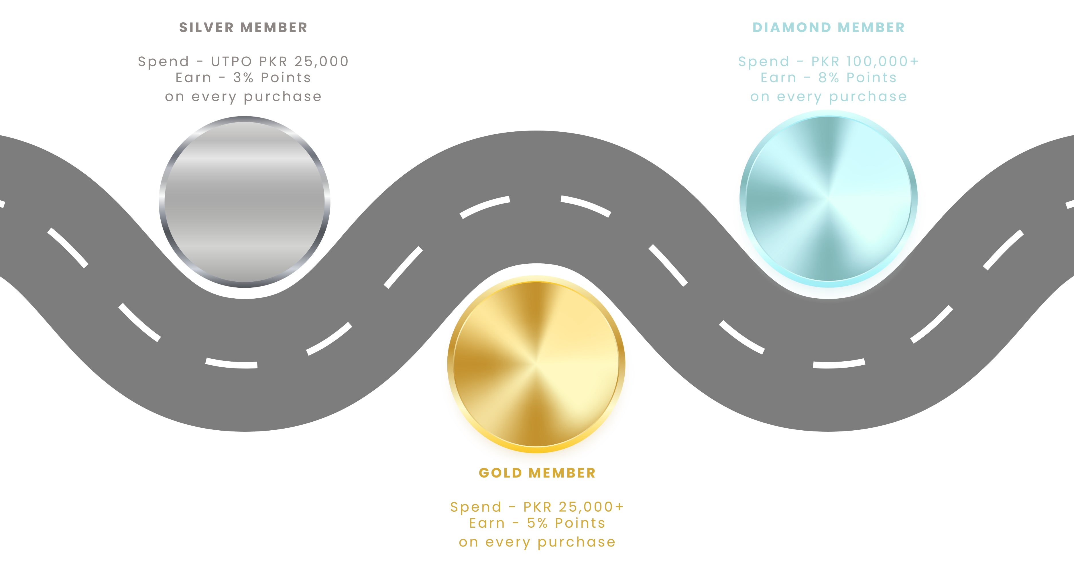Silver Member: Spend up to Rs. 25,000 and earn 3% points on every purchase. Gold Member: Spend Rs. 25,000+ and earn 5% points on every purchase. Diamond Member: Spend Rs. 100,000+ and earn 8% points on every purchase. Please note reward points are Exclusive of Taxes..