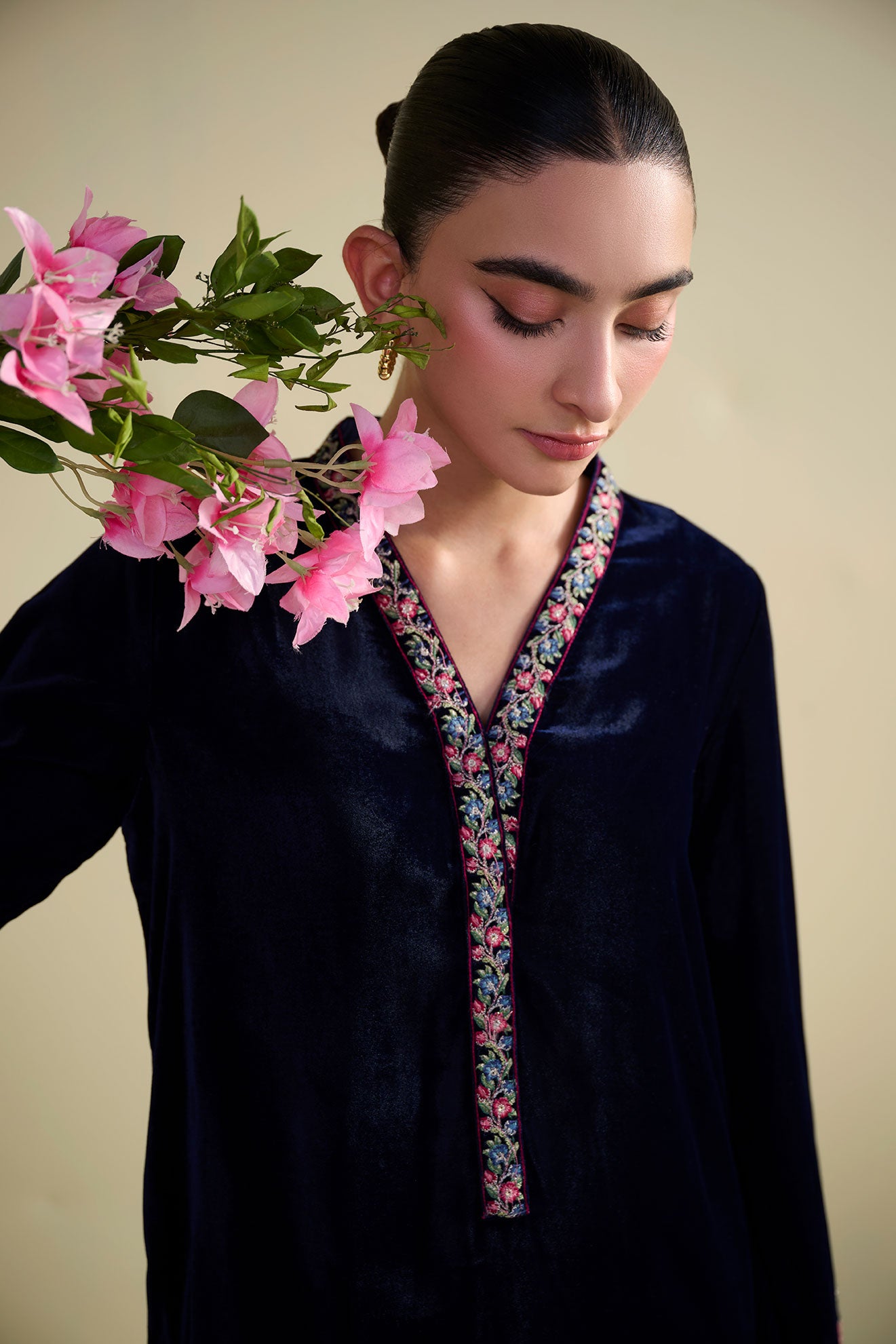 A navy velvet ensemble adorned with intricate floral embroidery in soft pink and mint tones, delicately accentuated with mirror and threadwork detailing. The straight silhouette paired with tapered trousers strikes the perfect balance between traditional artistry and contemporary grace. A timeless choice for evening soirées and winter festivities alike.