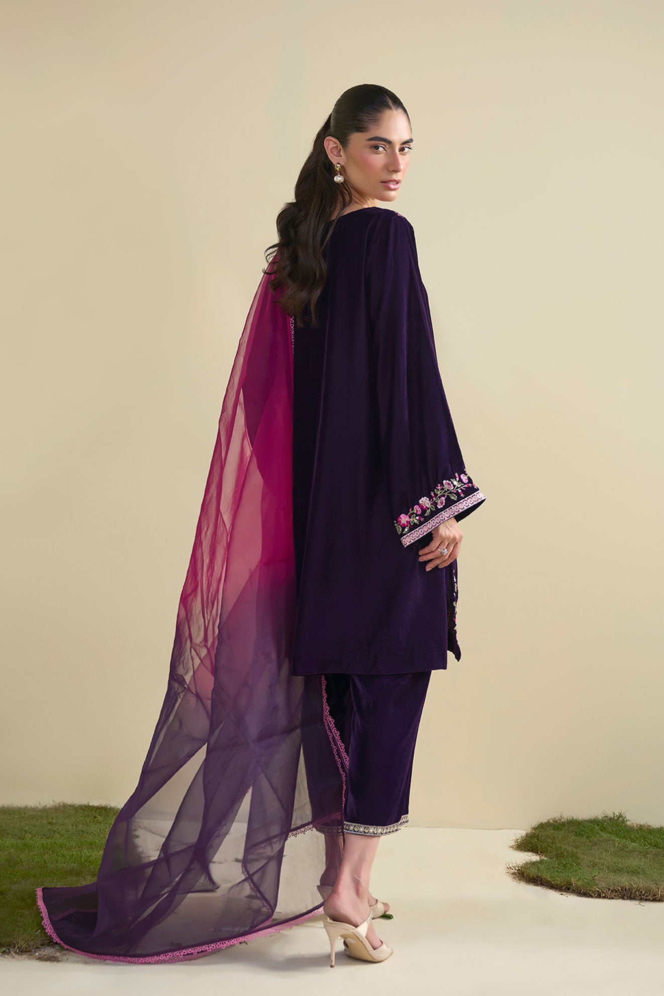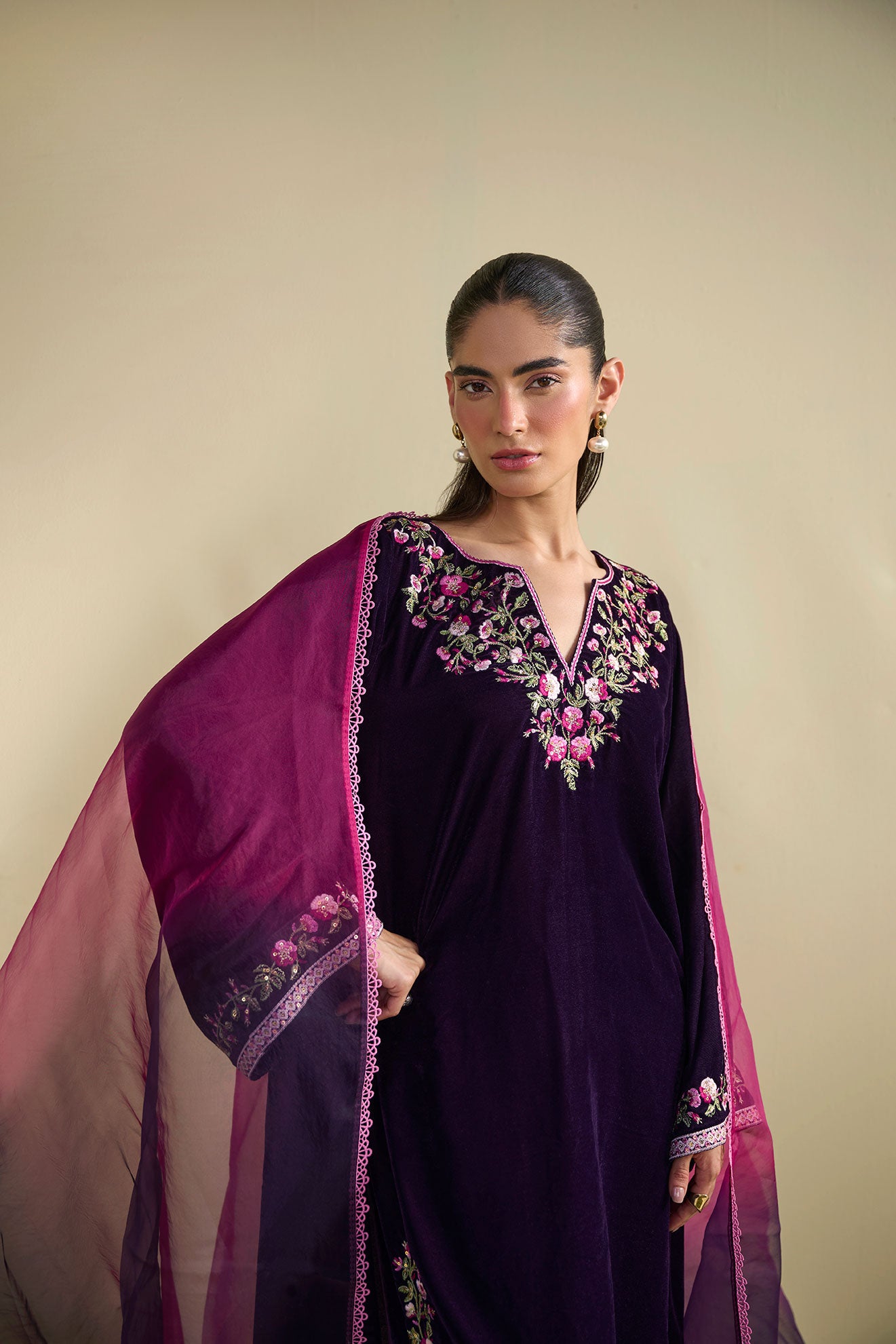 A deep purple velvet two-piece ensemble, gracefully adorned with delicate floral embroidery in shades of pink and green across the neckline, sleeves, and hemline. Paired with matching velvet trousers featuring refined embroidered lace across the hem, this design embodies timeless elegance with a touch of festive charm.