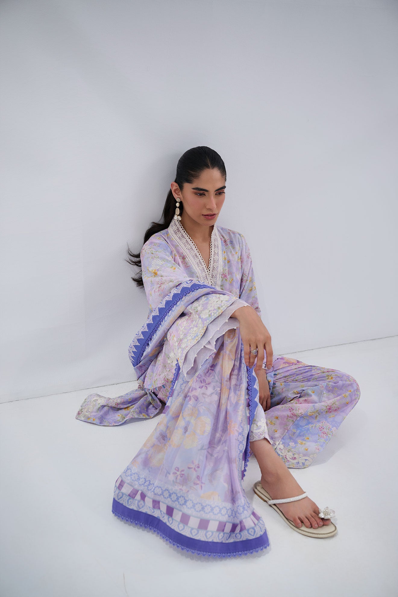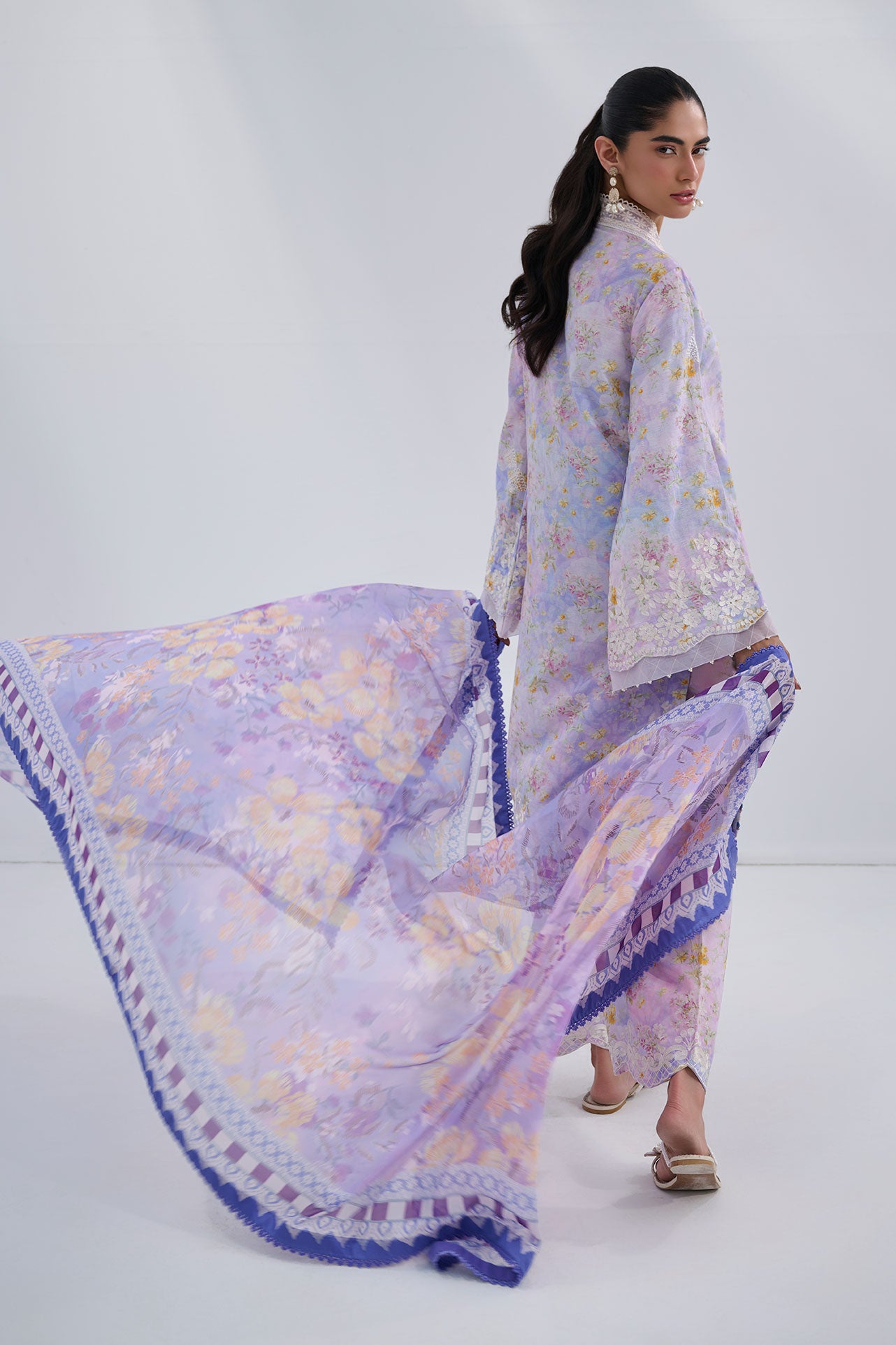 This two-piece ready-to-wear jacquard ensemble is crafted in a soft purple palette, featuring an intricately printed kurta enhanced with delicate embroidery along the neckline, sleeves, and scalloped hem. Paired with matching wide-leg trousers finished with refined detailing. Lightweight and effortlessly graceful, it is ideal for Ramadan gatherings, daytime festivities, and elevated everyday wear.