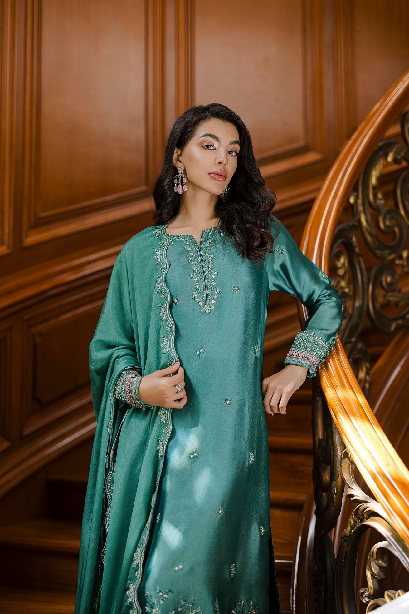 This three-piece luxury ensemble in a captivating green hue is adorned with delicate embroidery and intricate embellishments. The shirt features finely detailed work along the neckline, sleeves, and hem, paired with matching trousers and a flowing dupatta that enhances its graceful appeal.