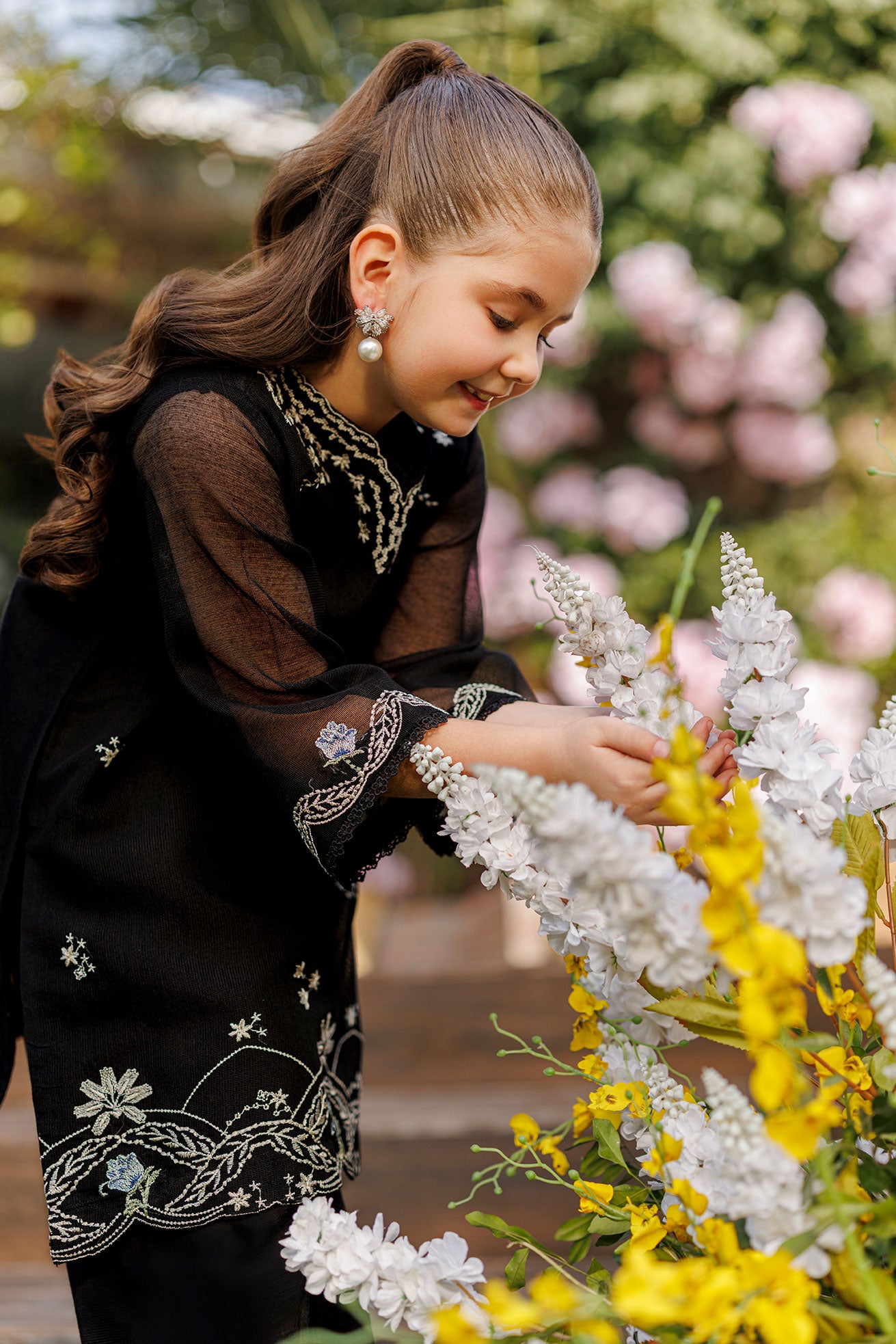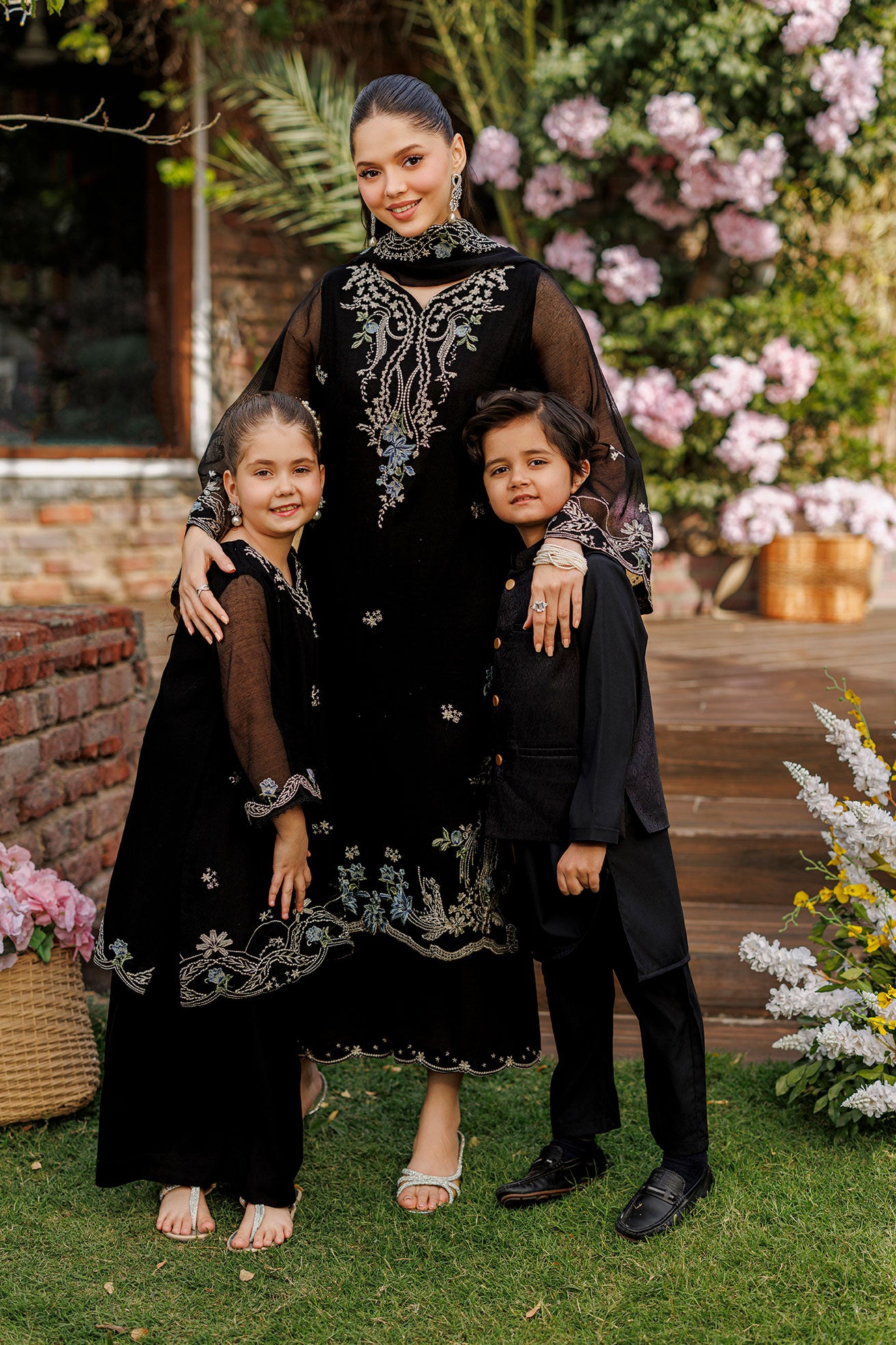 This black ensemble for girls features delicate pastel embroidery thoughtfully placed along the neckline and hem. The soft detailing adds a charming festive touch, paired with flowing bottoms that offer both comfort and effortless style.