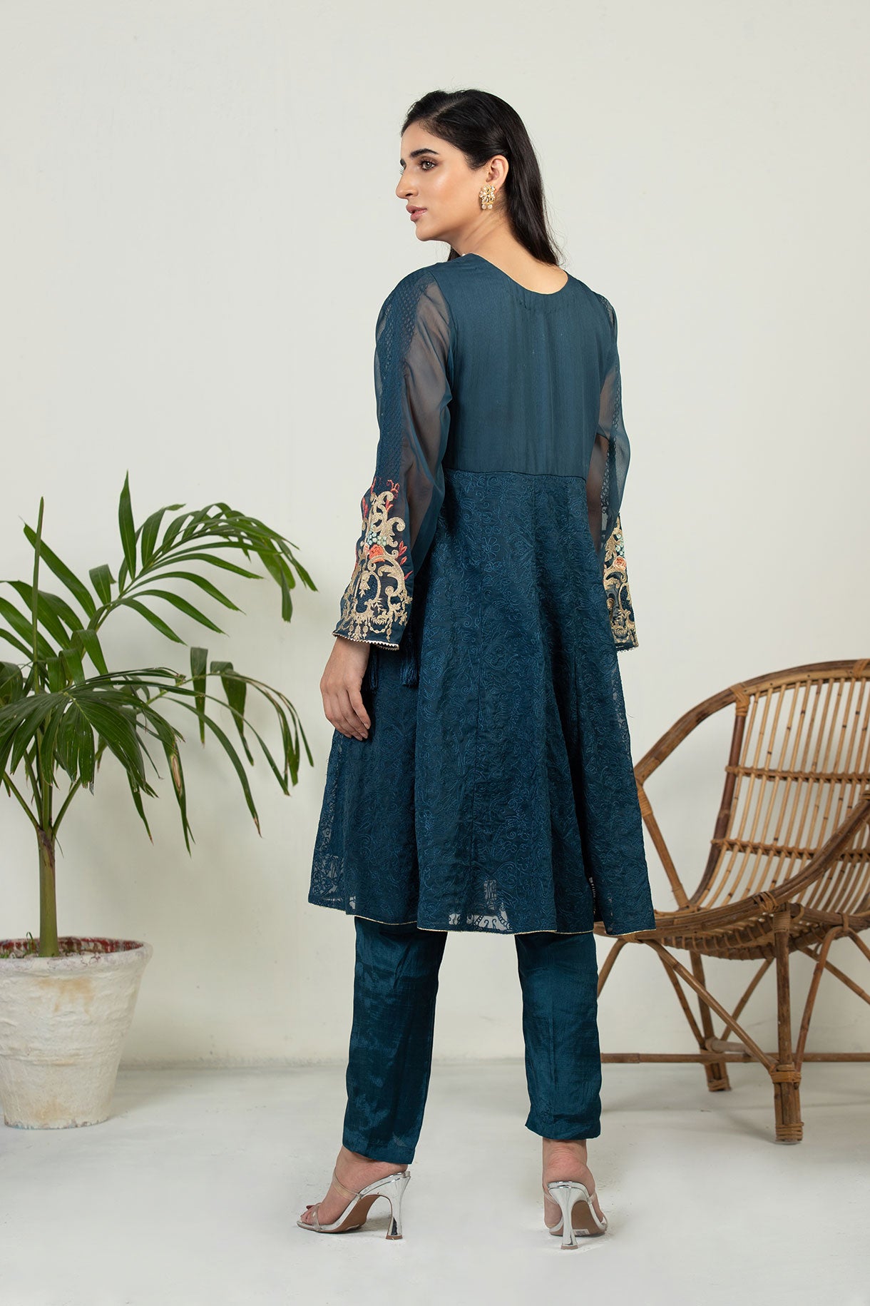 Enhanced with exquisite embroidery on chiffon fabric in a beautiful solid blue this signature piece is a must have this season.