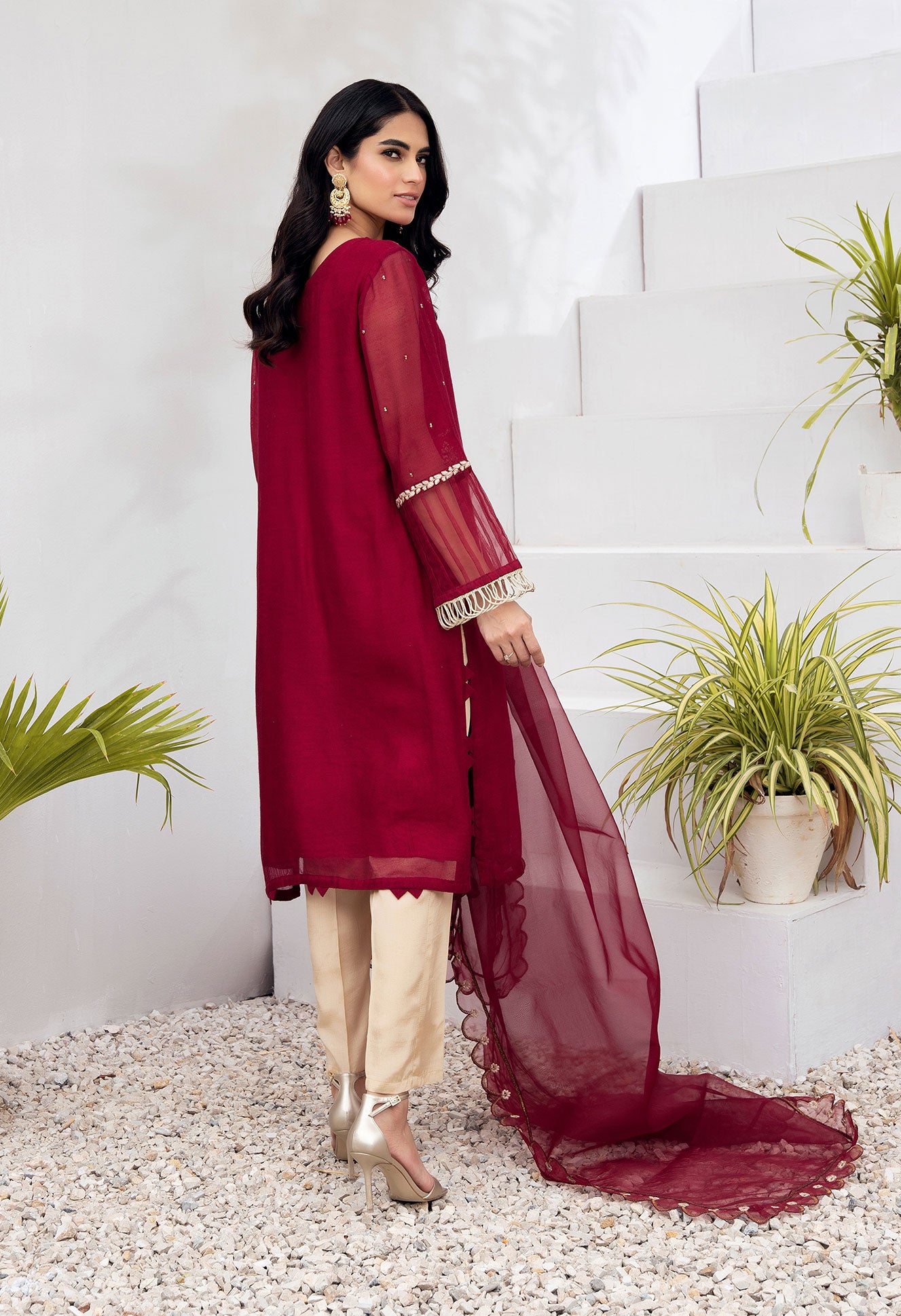 Elegant maroon canvas featured on opulent khaddi net fabric with intricate details. Keep slaying in the change of seasons with Dhanak's festive fall edit.