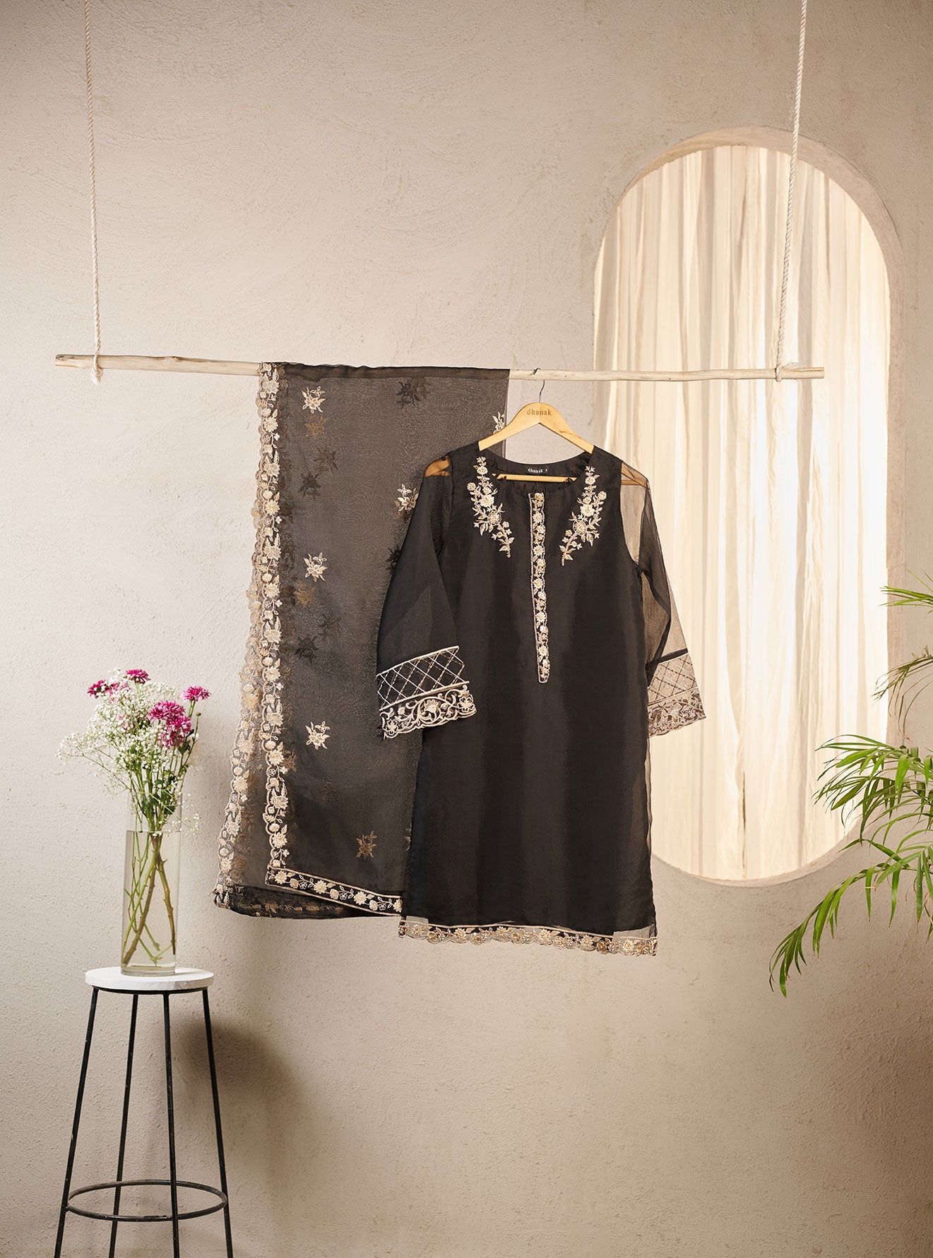Crafted on a beautiful bold black on organza fabric this kurta and dupatta duo exhibits sumptuous embroidery details that set your style apart.