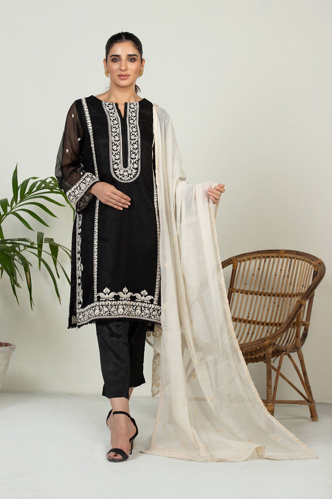 Black and white a classic combination for ages. This time Dhanak brings this classic art with a touch of traditional embroideries on both shirt and dupatta which makes it a perfect look for any fine evening or a formal event.