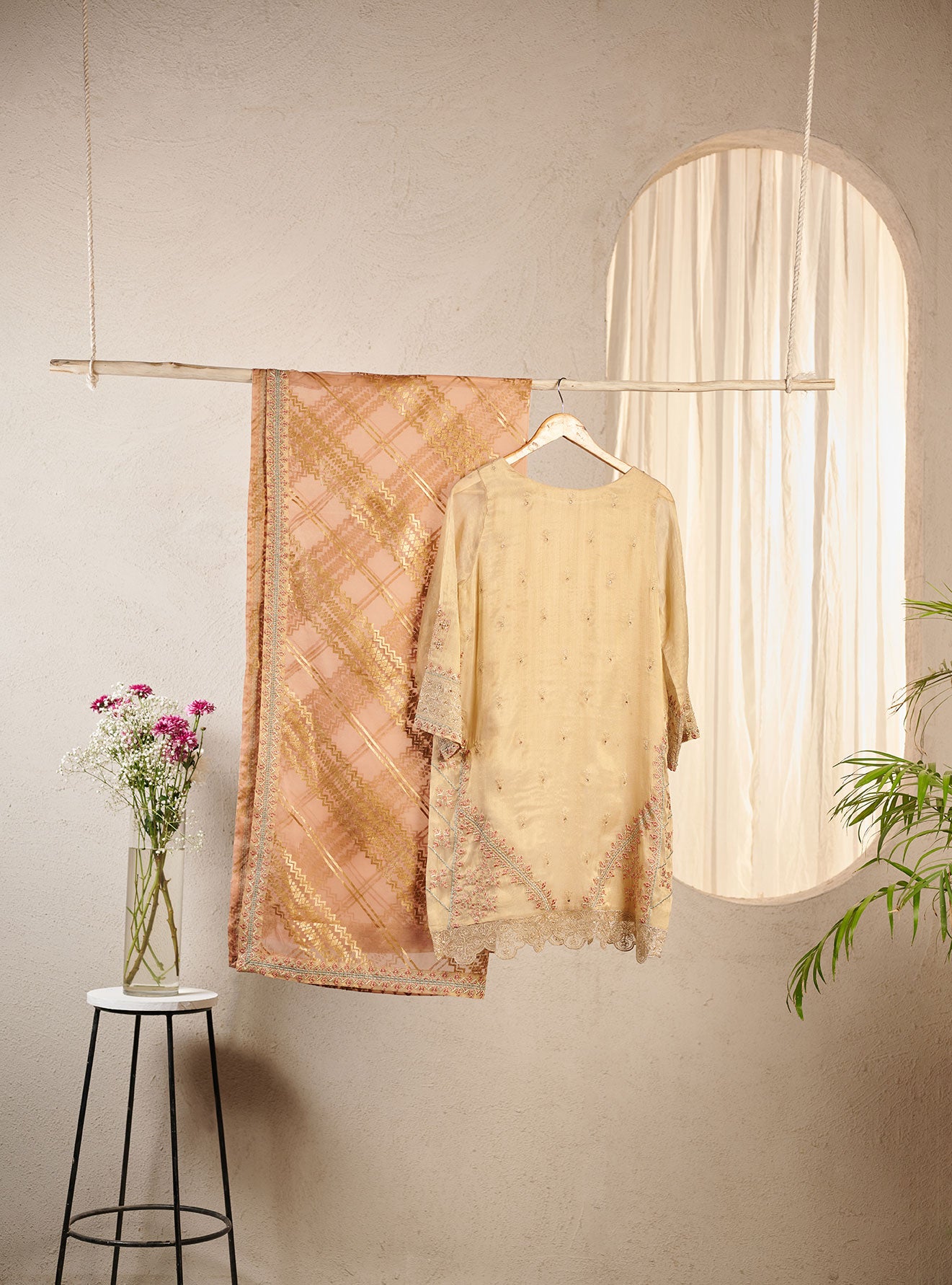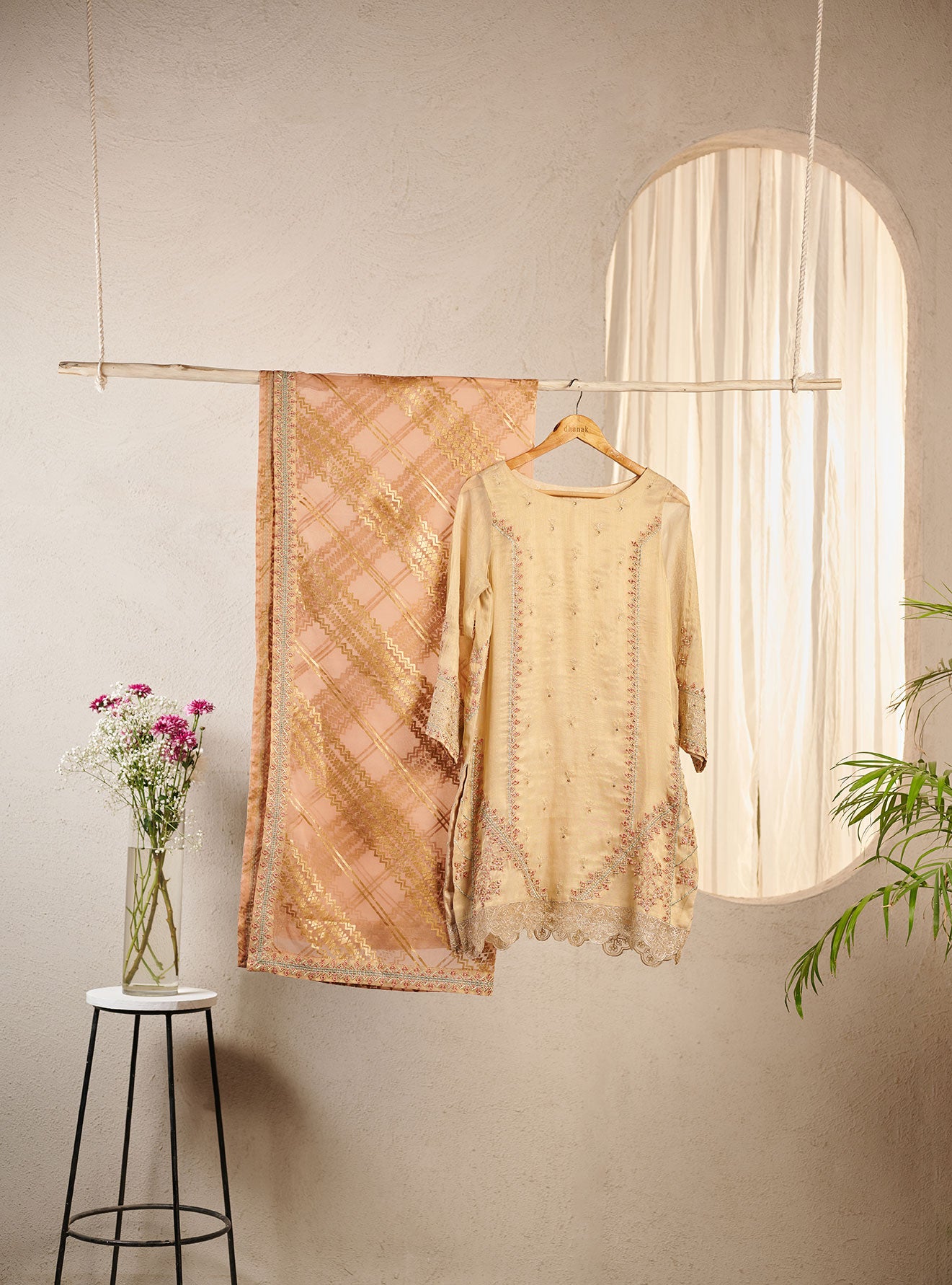 Beige embroidered kurta and dupatta crafted on messori fabric with fine embroidery details that radiates timeless charm.