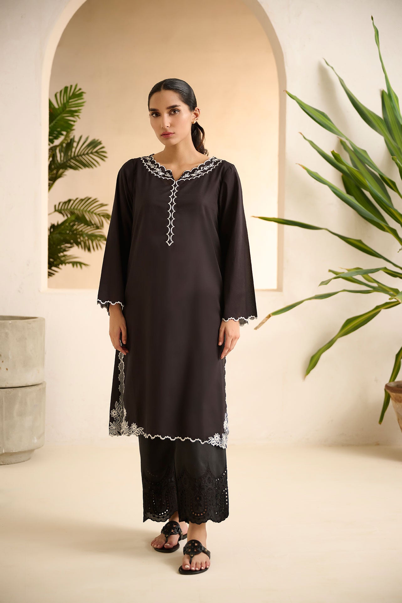Crafted from breathable lawn fabric, the kurta offers a comfortable and lightweight feel. The intricate white embroidery beautifully contrasts against the black background, adding a touch of sophistication and refinement. With its classic silhouette and versatile design, this kurta is perfect for both formal and casual occasions. Embrace the understated beauty of monochrome fashion with Dhanak.