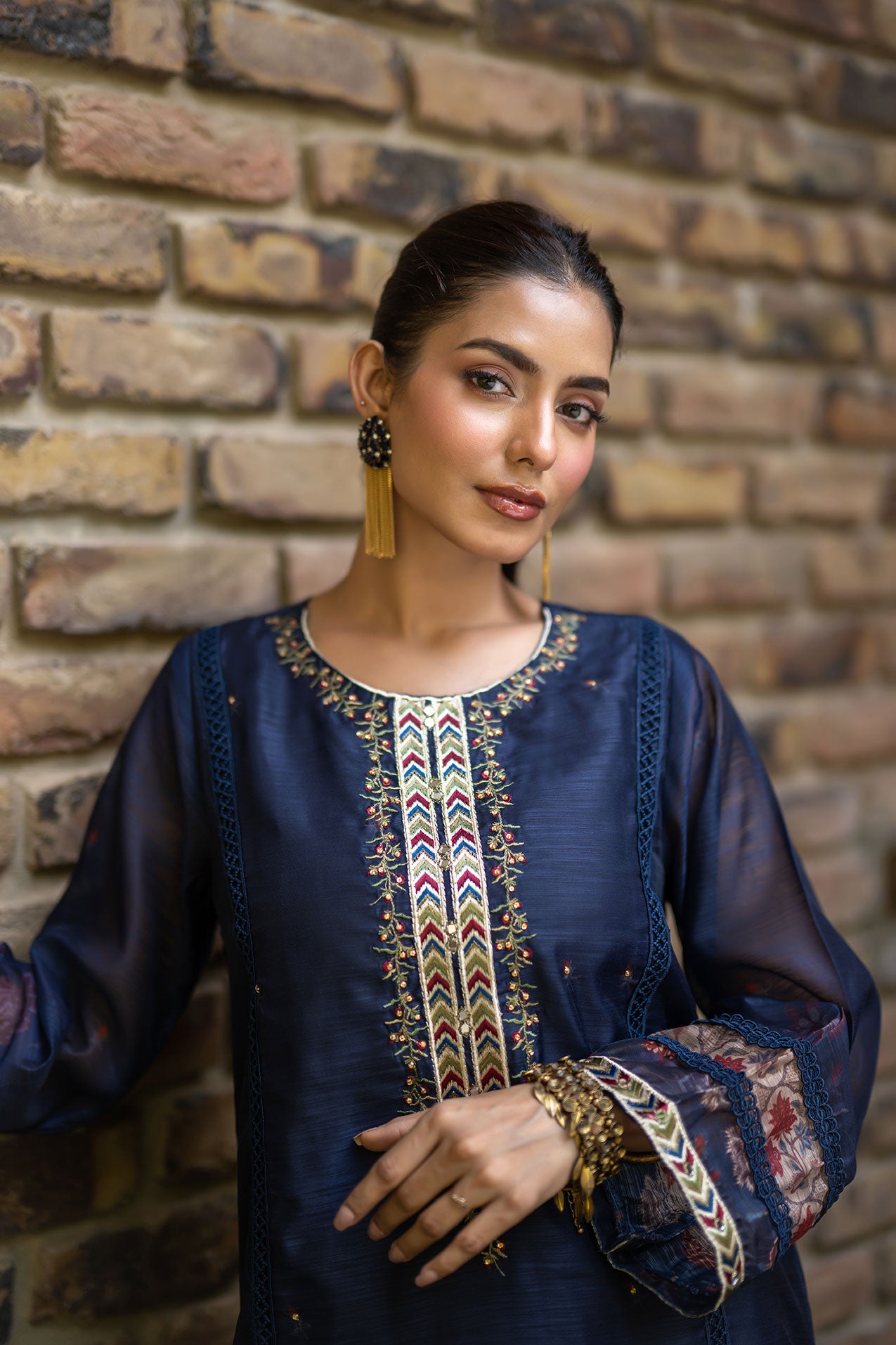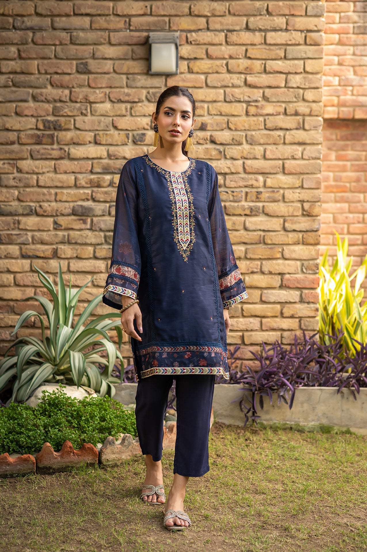 Crafted on a solid palette with exquisite embroidery details on shirt, finish off with plain straight raw-silk pants. This festive season update your wardrobe with alluring styles from dhanak.