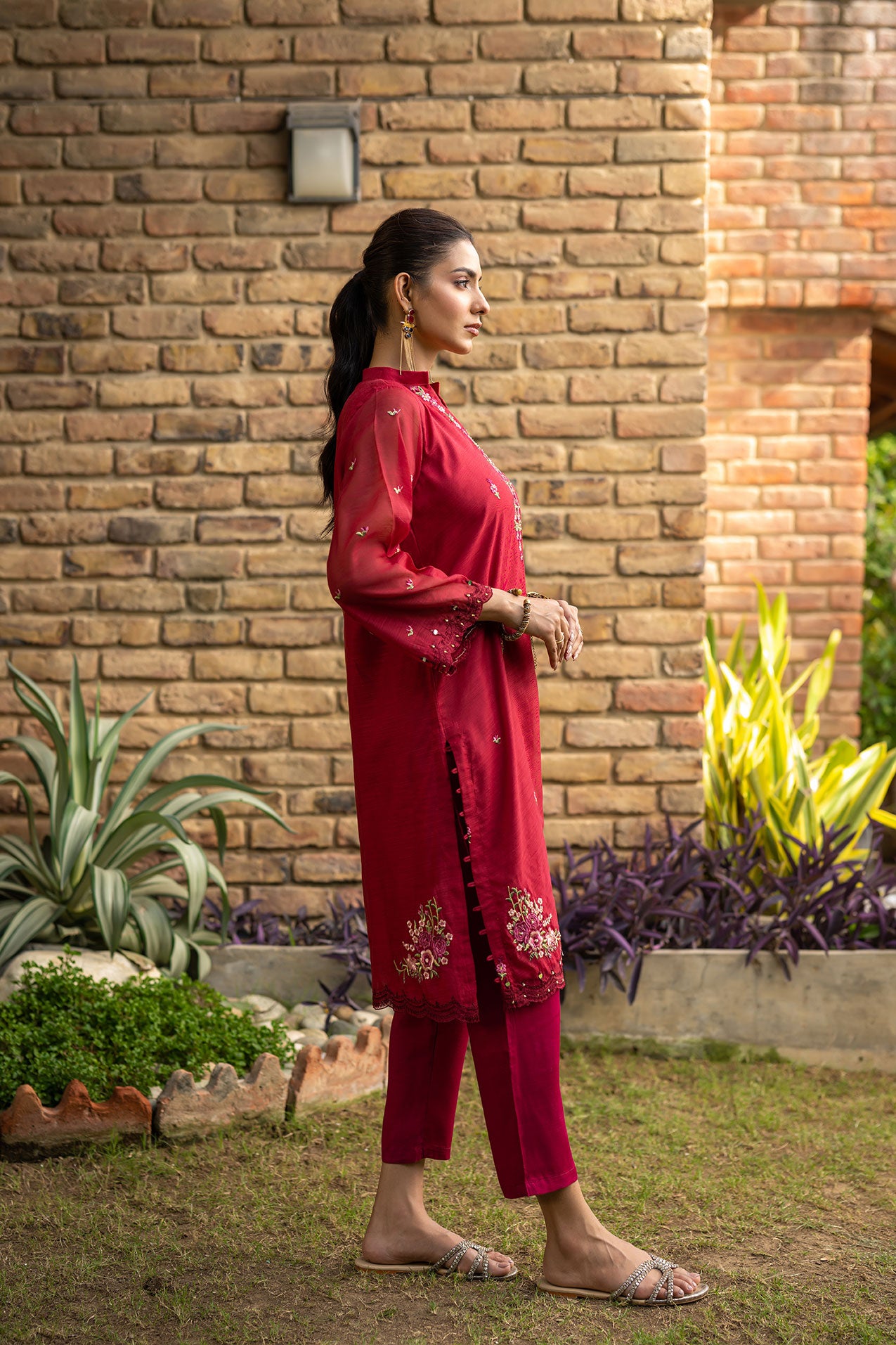 This solid tone two-piece ensemble sets the festive tone with its alluring embroidery and collar style that uplifts the overall look finish off with plain straight raw-silk pants. Update your wardrobe with festive pieces from dhanak.
