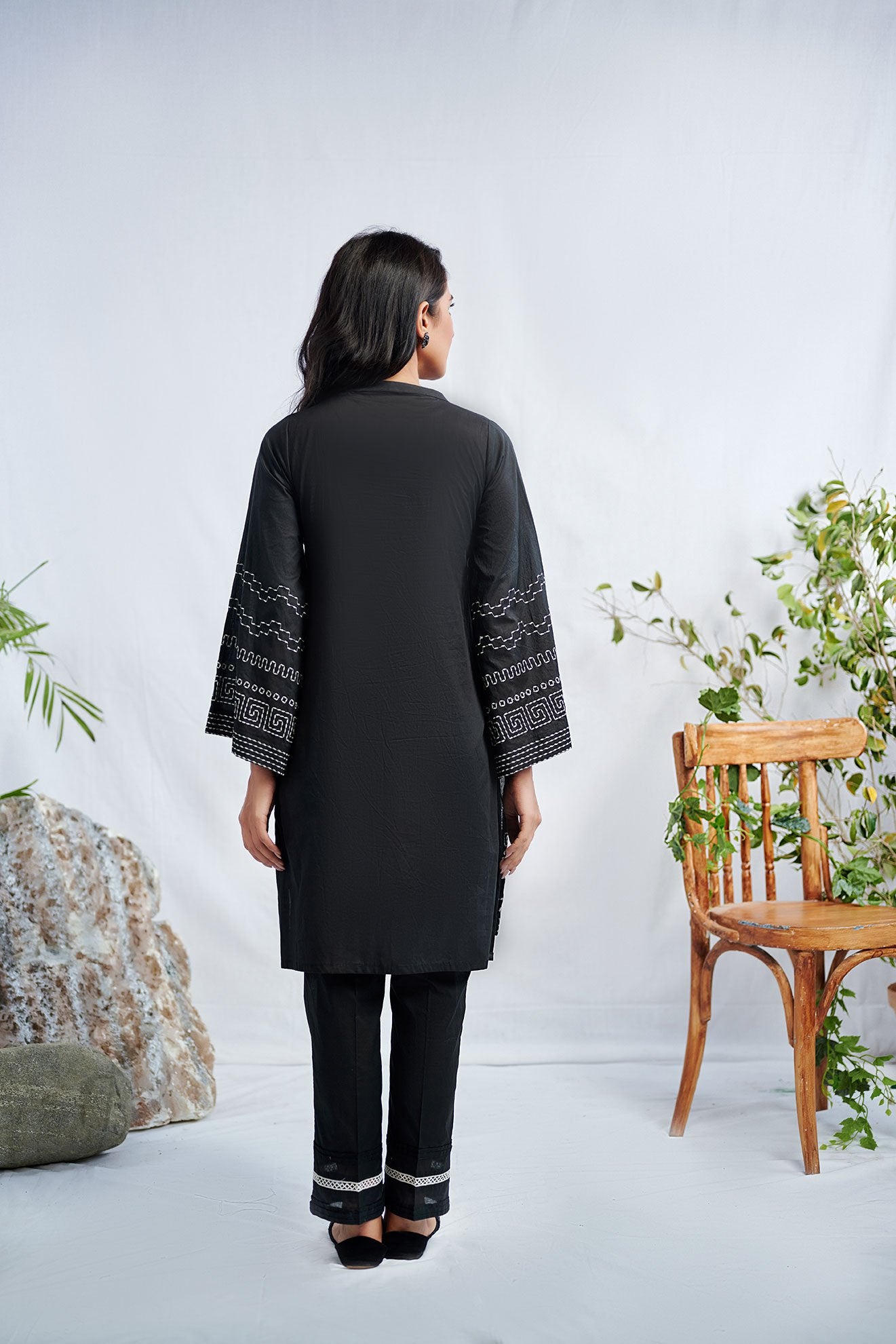 A solid black canvas adorn with riveting embroidery to spruce up the look. Dhanak's black and white is your summer favourite look.