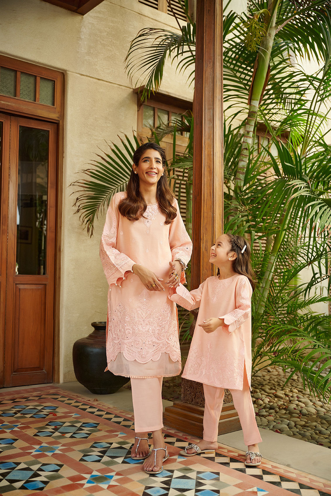 Adorned in the muted shade of pink, this elegant piece is embedded with organza lace, enhanced with mirror embellishment and sublime embroidery. A subtle ethnic style from Mommy & me collection by Dhanak.