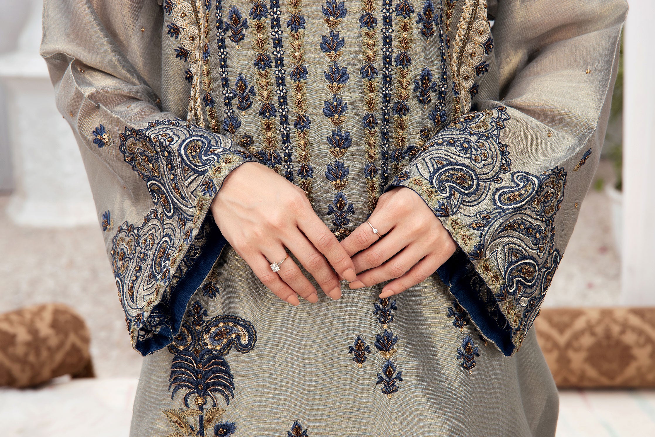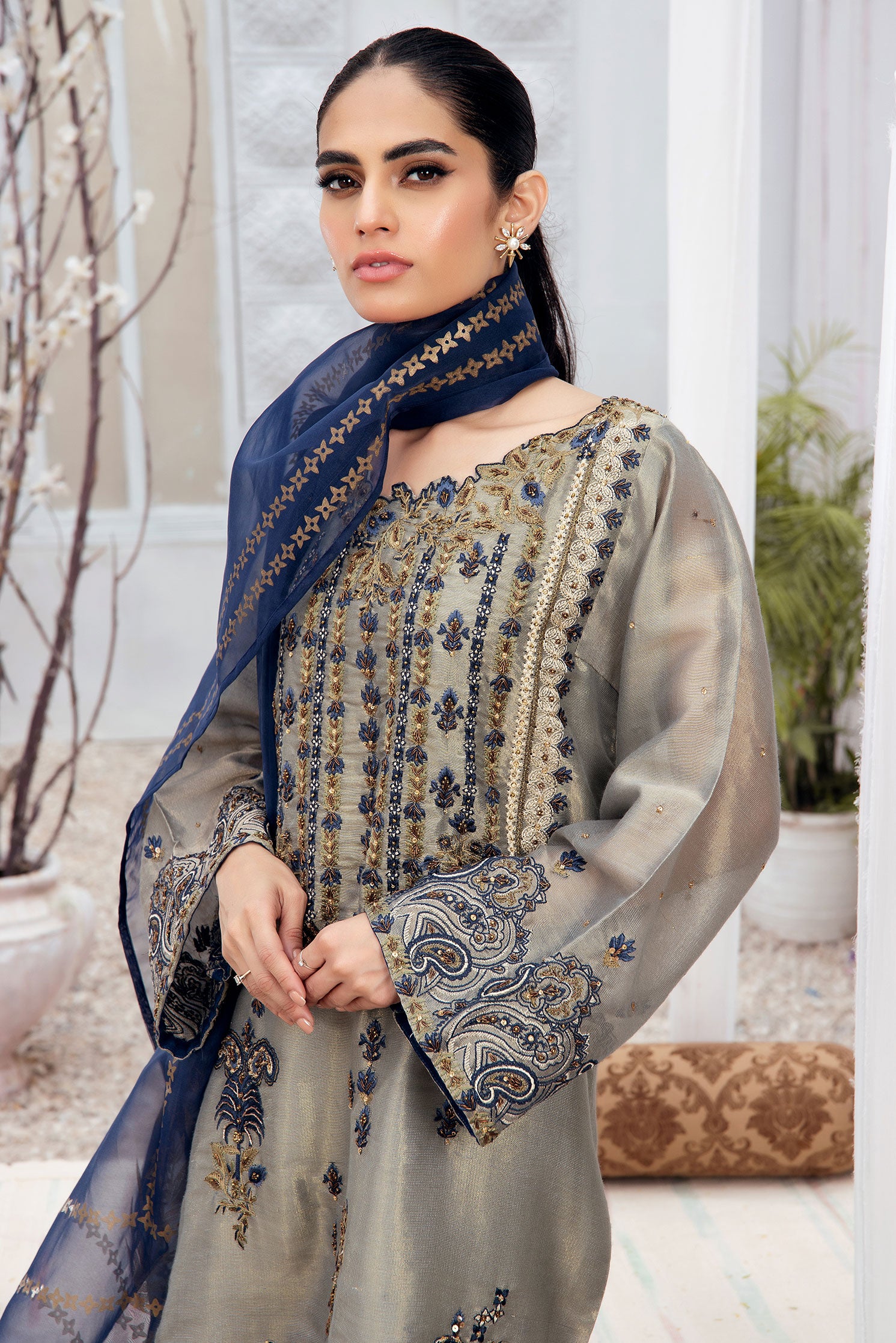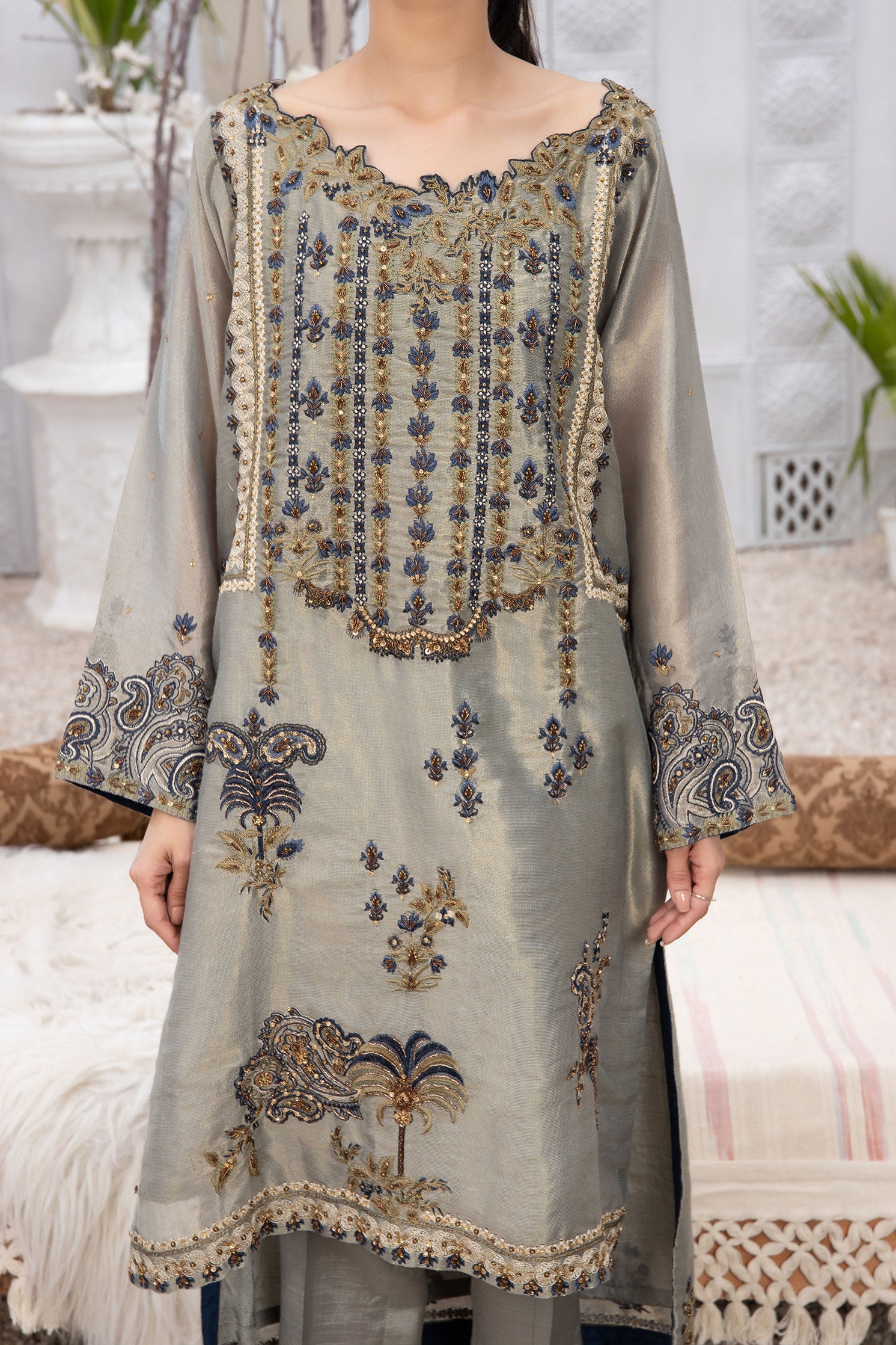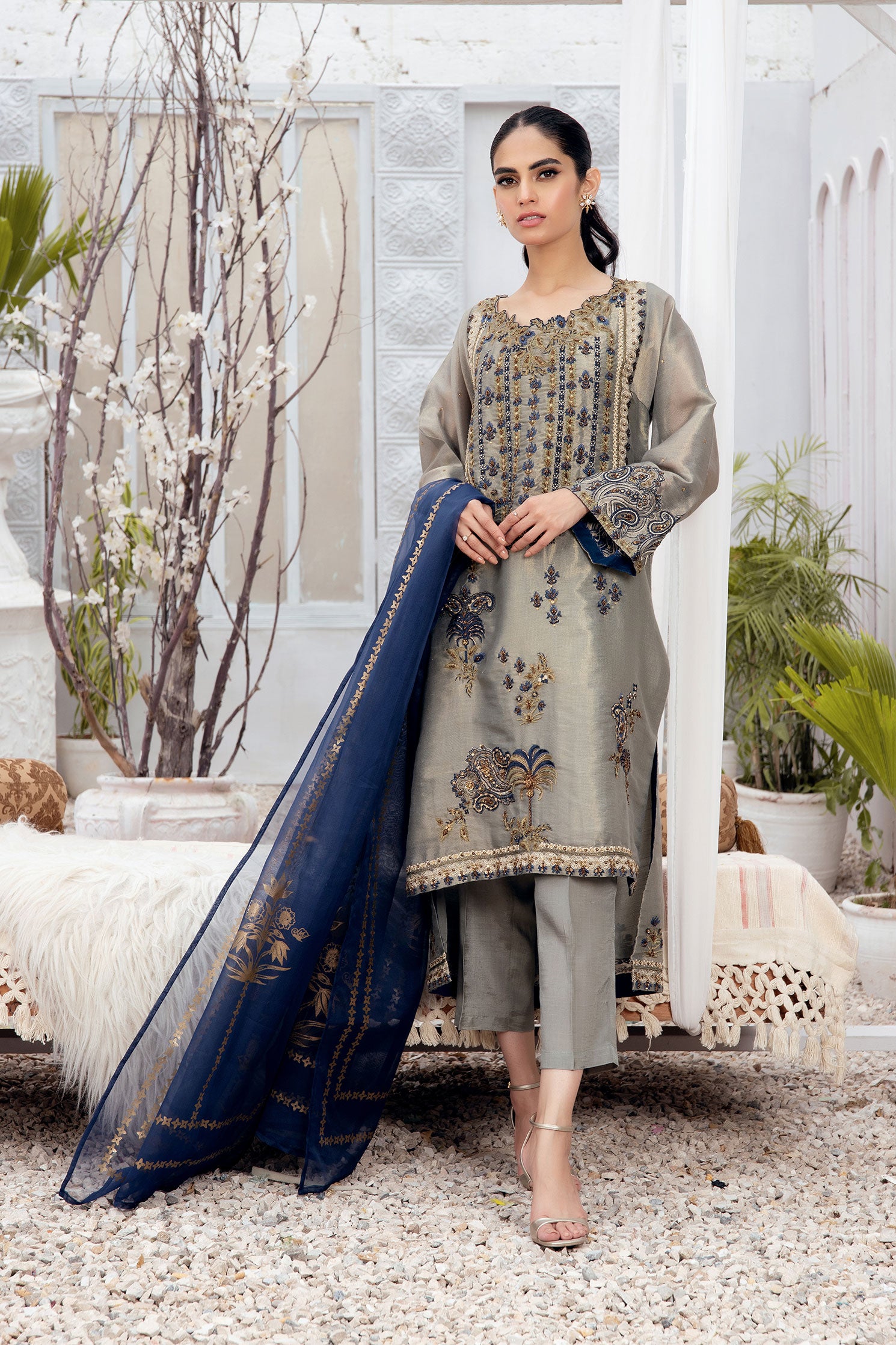 Casted on cotton-messori fabric this delicately embroidered three-piece ensemble from Dhanak is a must have festive staple.