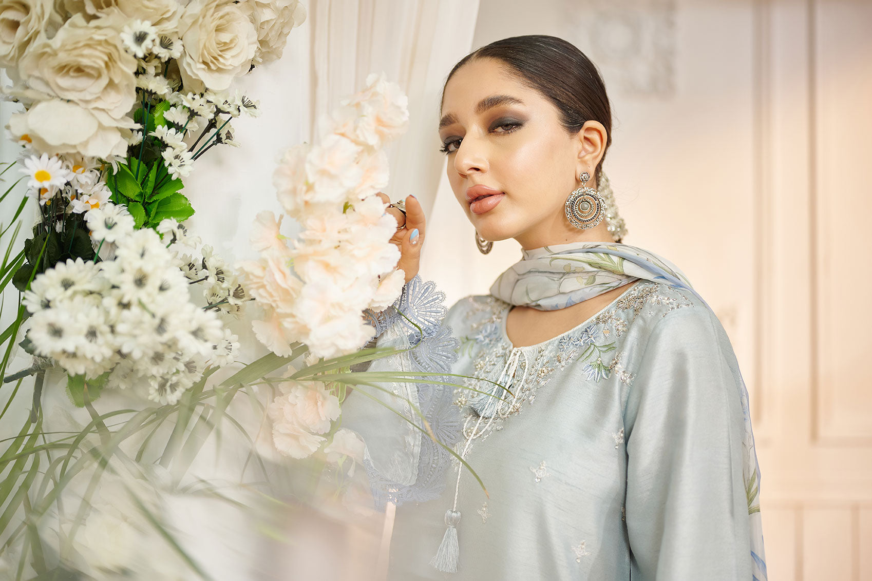 Canvassed on cotton organza fabric this opulent luxury three-piece design features sleek embroidery, mirror work and detailed embroidered lacework with dori gala detail. This outfit is completed with silk dupatta and straight pants.