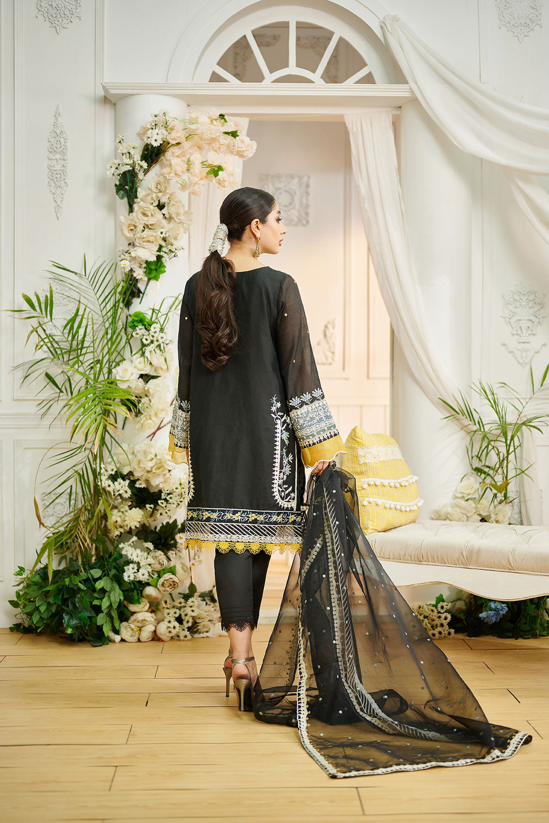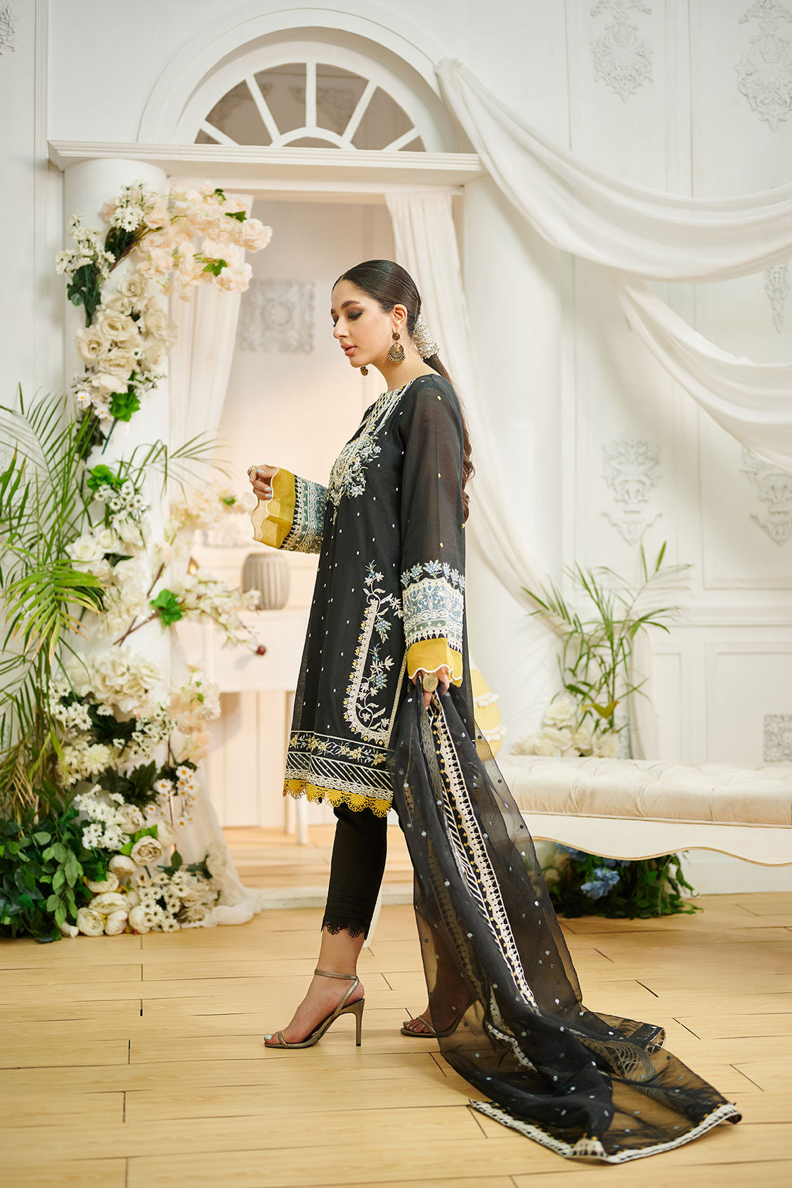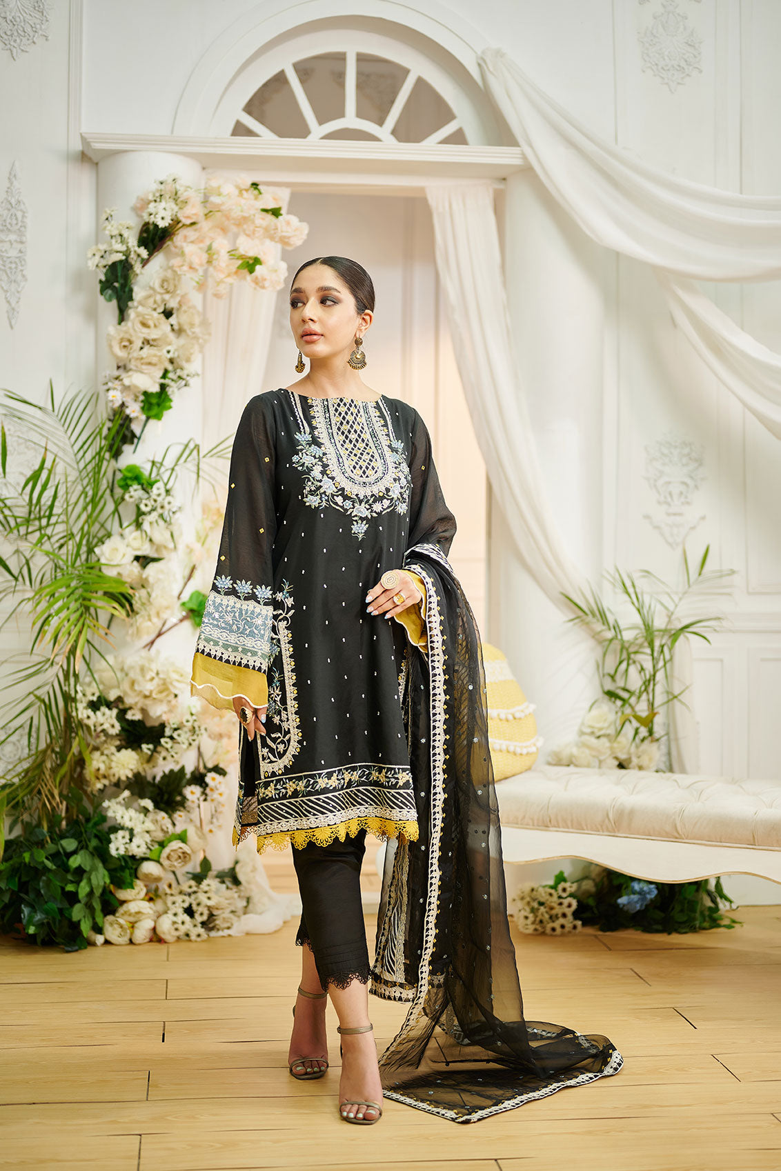 Cotton organza three-piece luxury ensemble composed with intricate embroidery on shirt and dupatta paired with straight raw-silk pants.