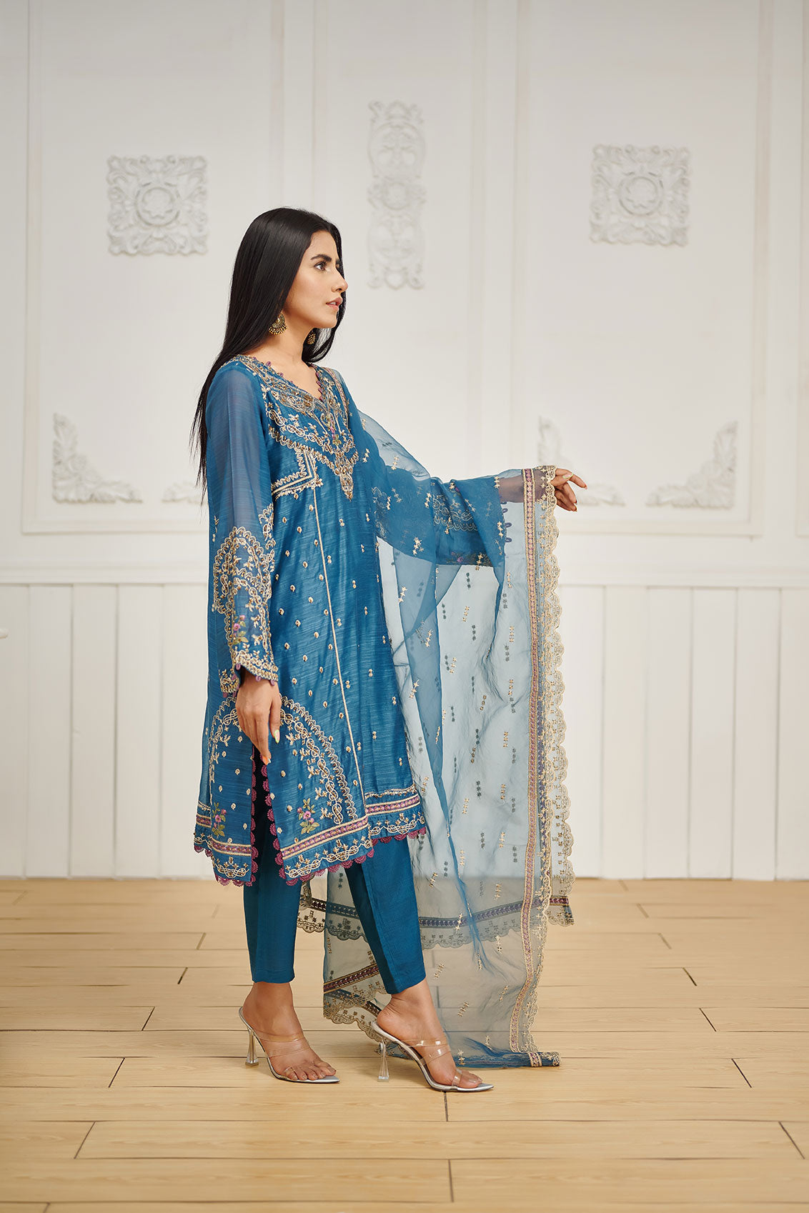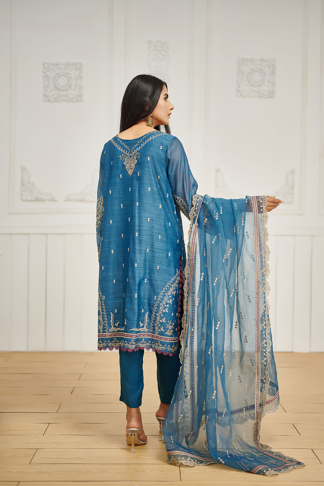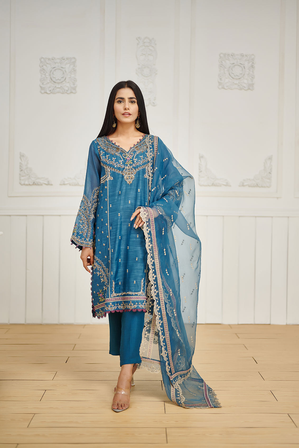 Intricately embroidered three-piece design accentuated with gaudy details laid on paper cotton fabric for shirt paired with lavishly embroidered net dupatta and plain raw silk pants.