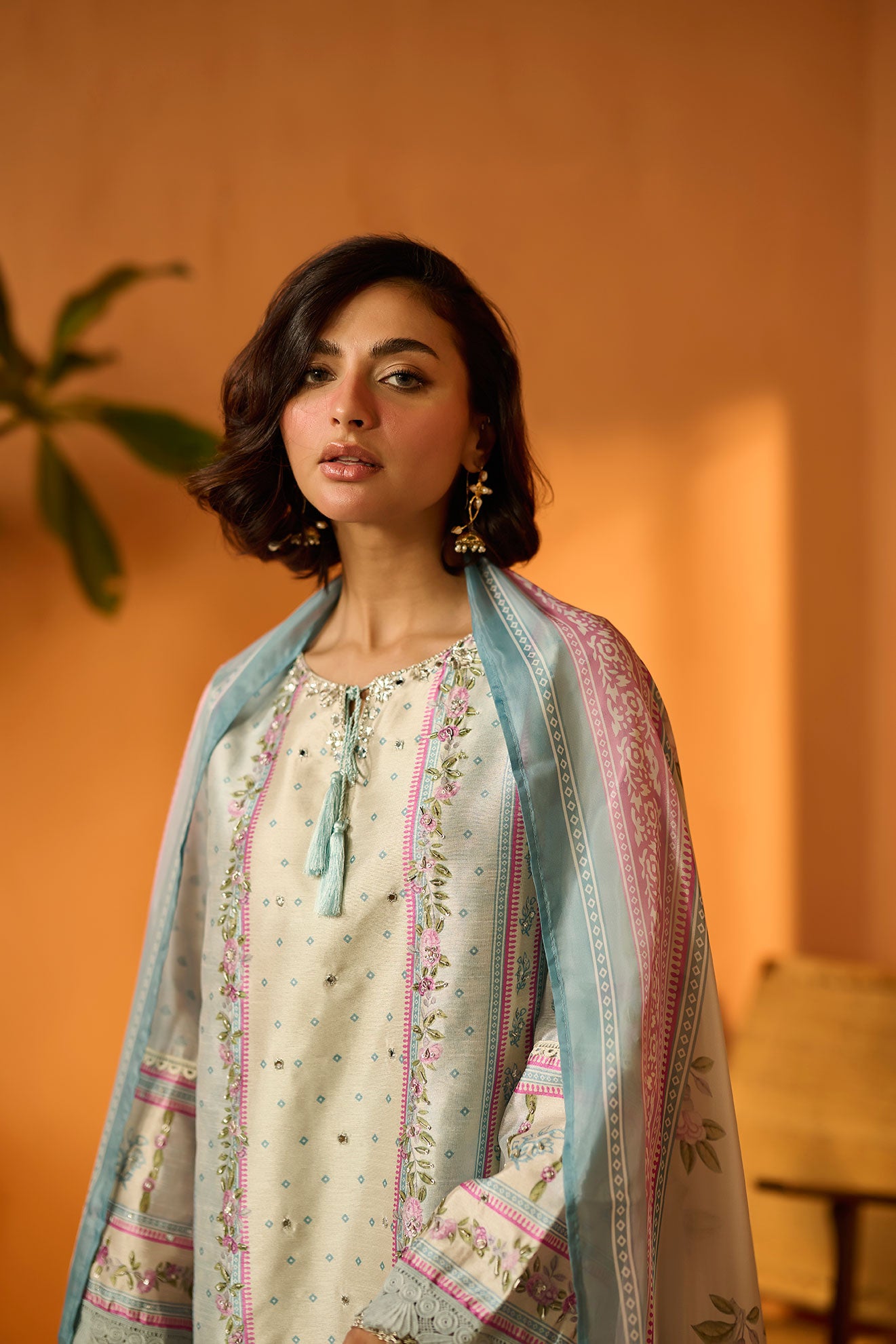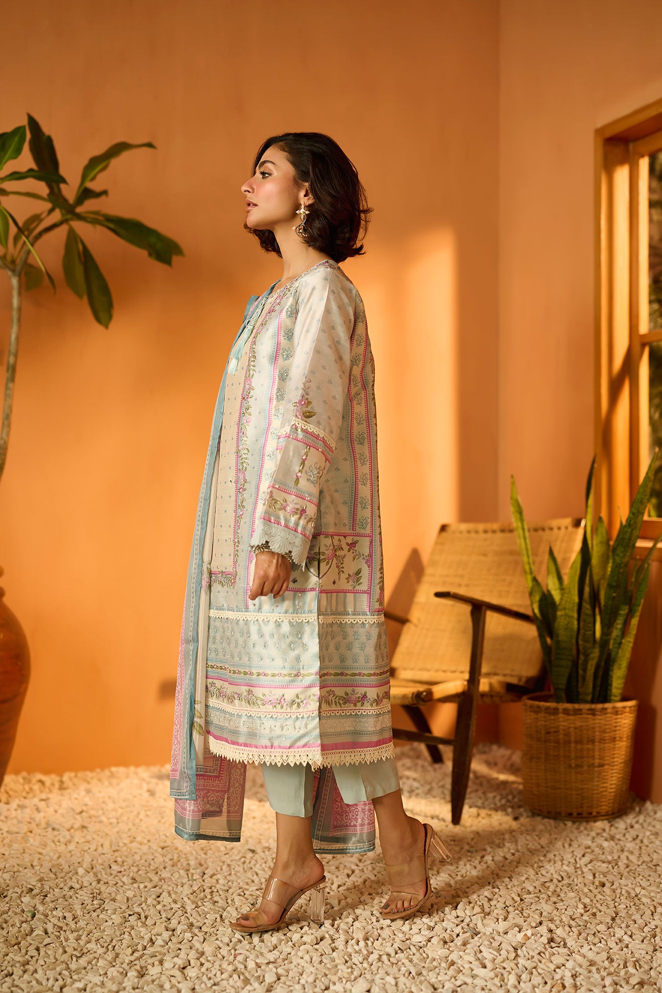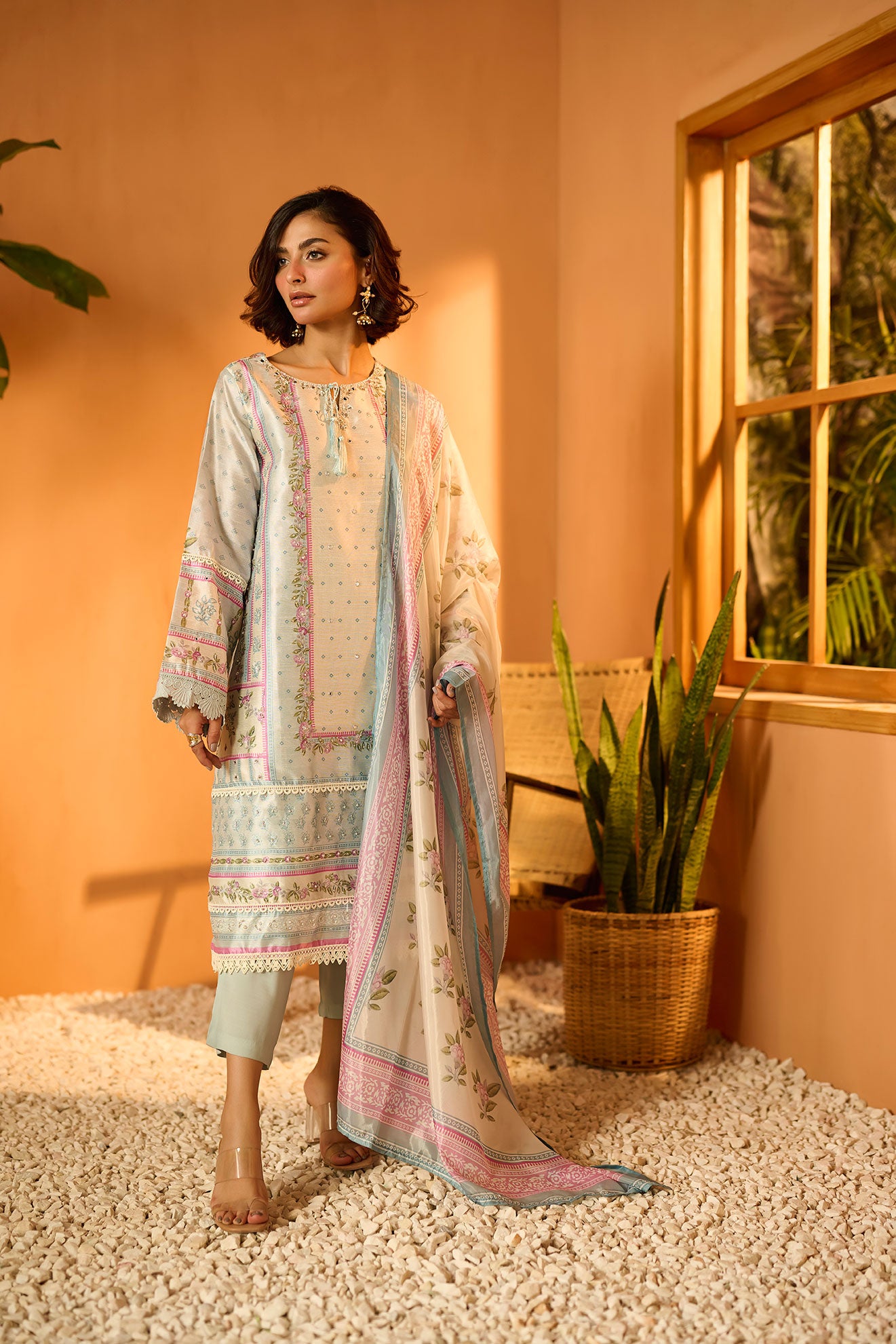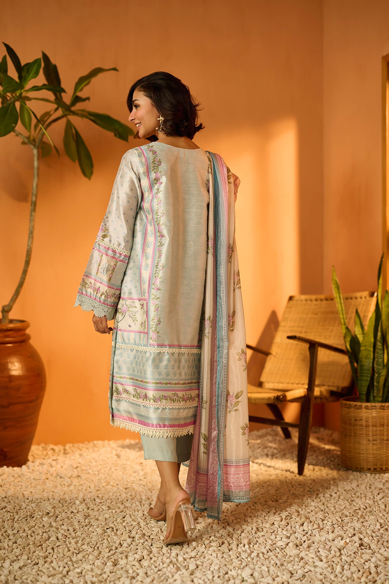 Based on a serene palette this palatial three-piece ensemble is eloquently put together to give you a charming glow this festive season.