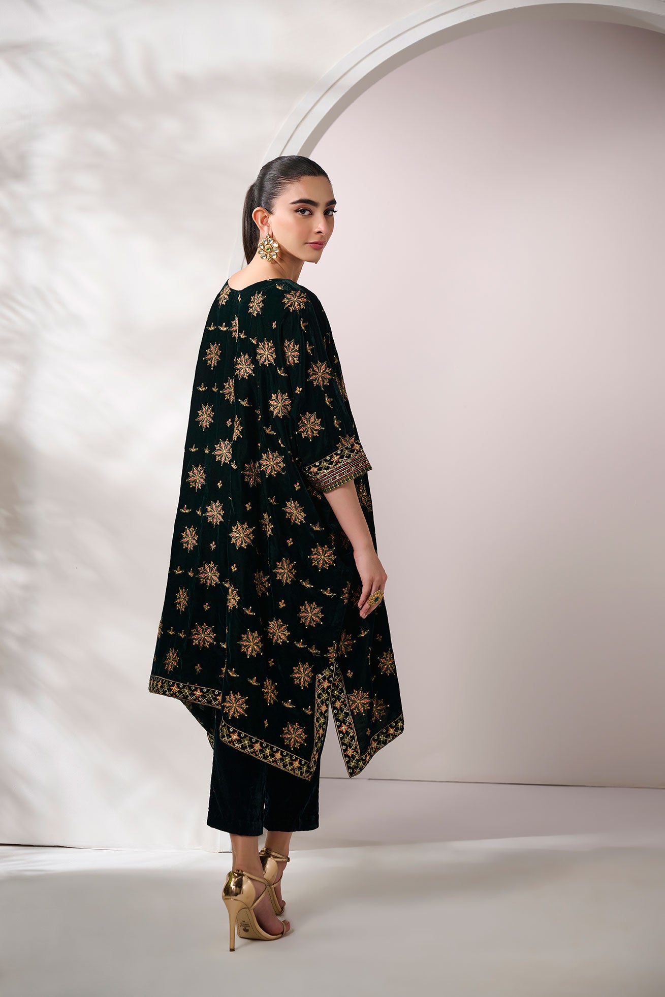 Turn heads this season with Dhanak's Velvet RTW Edit. This opulent green velvet cape-style kurta showcases intricate heavy embroidery, blending traditional charm with modern elegance. Its unique silhouette and exquisite craftsmanship make it a standout piece for festive celebrations and special occasions.