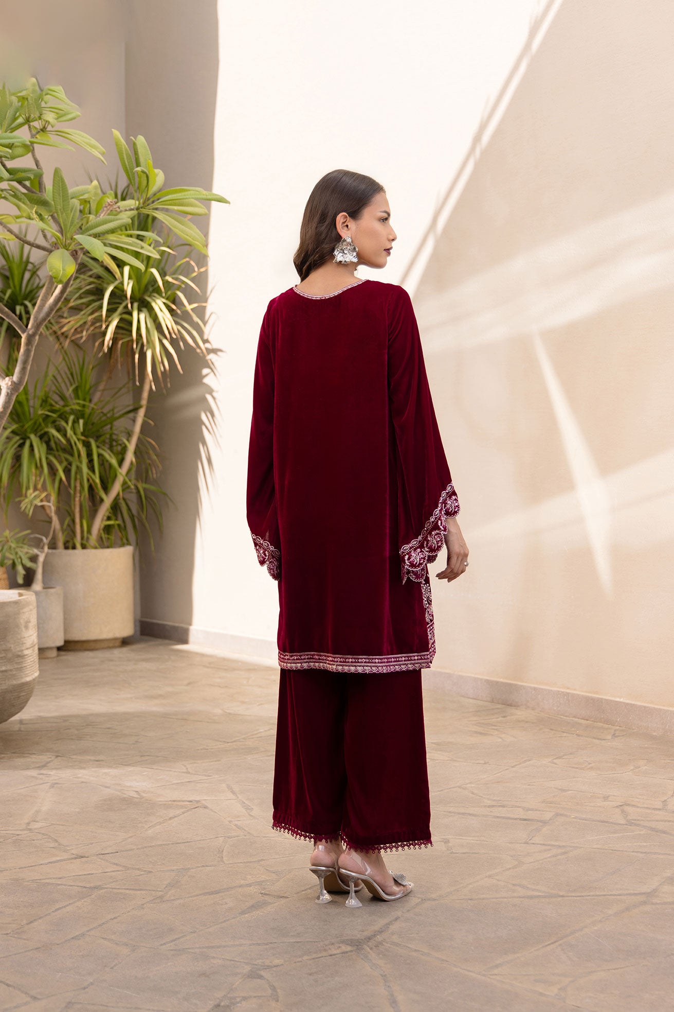 This two-piece velvet ensemble against a rich maroon backdrop exudes timeless sophistication. The kurta is beautifully adorned with intricate embroidery, creating a look of refined elegance. Paired with plain trousers accented by embroidered lace detailing, this set strikes the perfect balance between opulence and subtlety, ideal for festive occasions and evening gatherings.