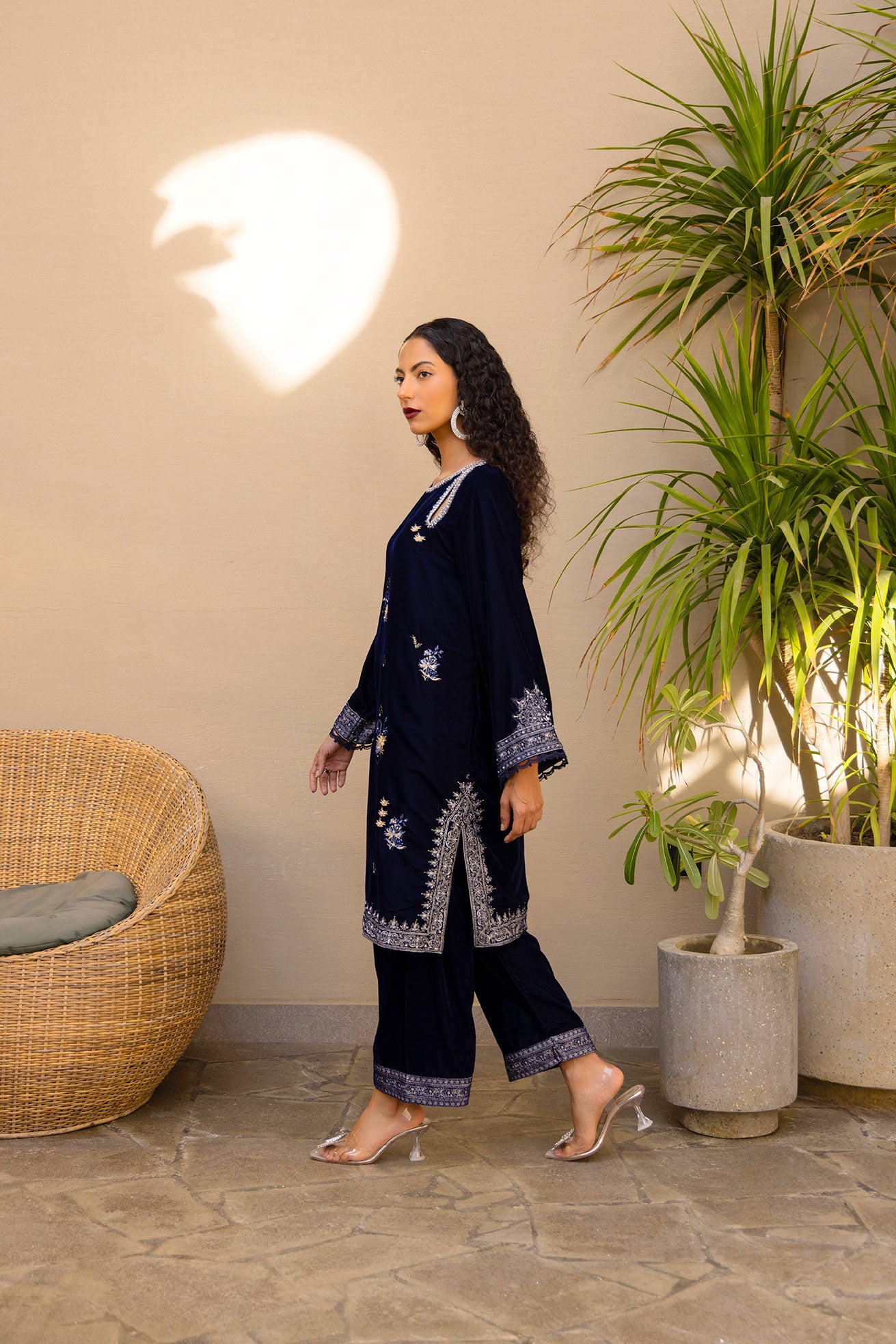 This blue velvet embroidered dress from Dhanak exudes elegance and sophistication. It combines luxurious texture with intricate detailing, creating a striking yet refined look. Paired with plain straight trousers, the ensemble balances rich embellishment with minimal sophistication, offering a timeless style that’s perfect for formal gatherings or evening wear.
