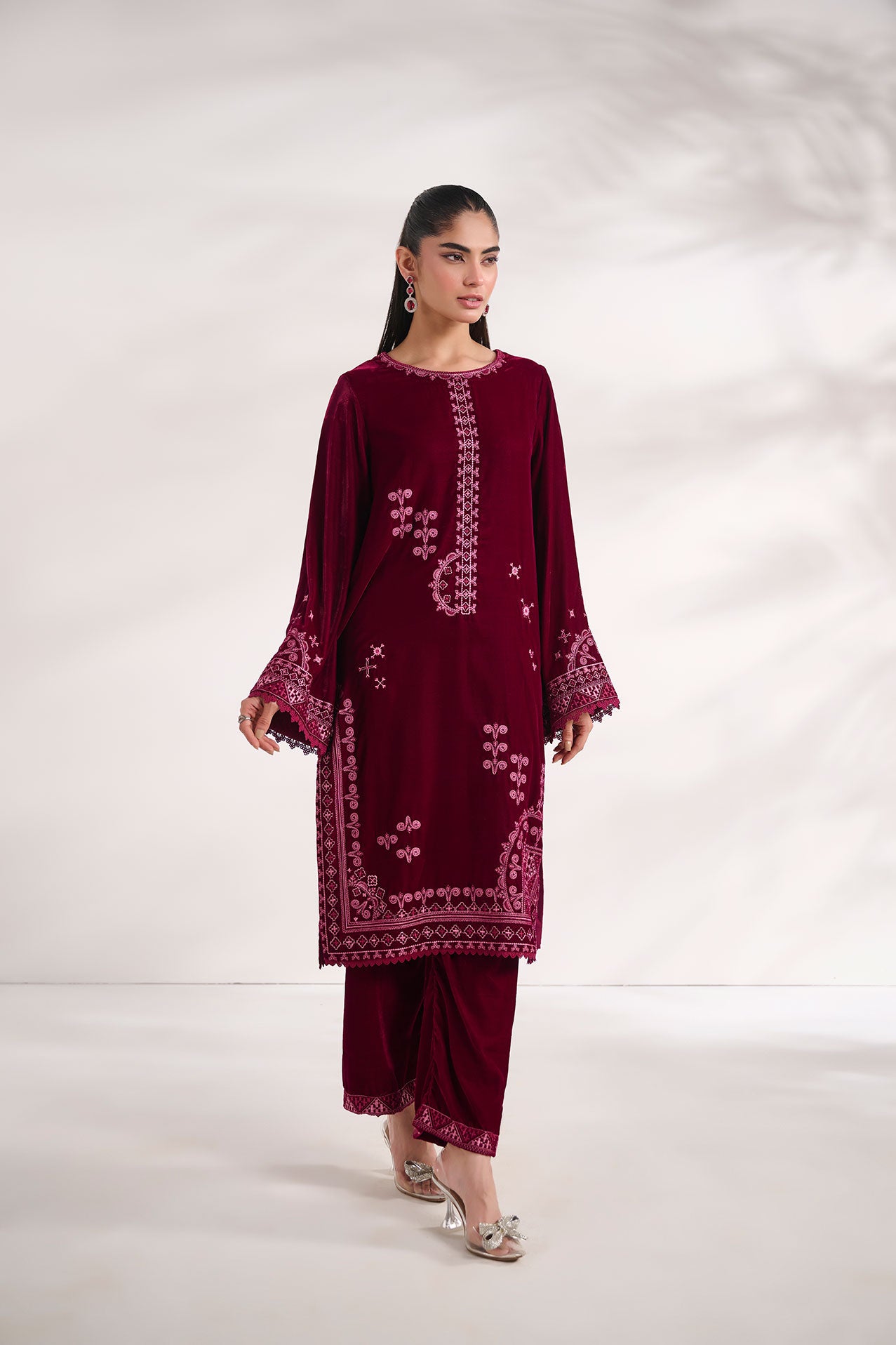 This two-piece velvet ensemble from Dhanak's RTW Velvet Edit features a beautifully embroidered kurta, adorned with floral contrasting embroidery across the shirt highlighting neckline, sleeves, and daman. The intricate detailing is elevated with embroidered lace accents, adding a touch of finesse. Paired with embroidered velvet trousers, this outfit is a stunning blend of sophistication and artistry, perfect for festive occasions.