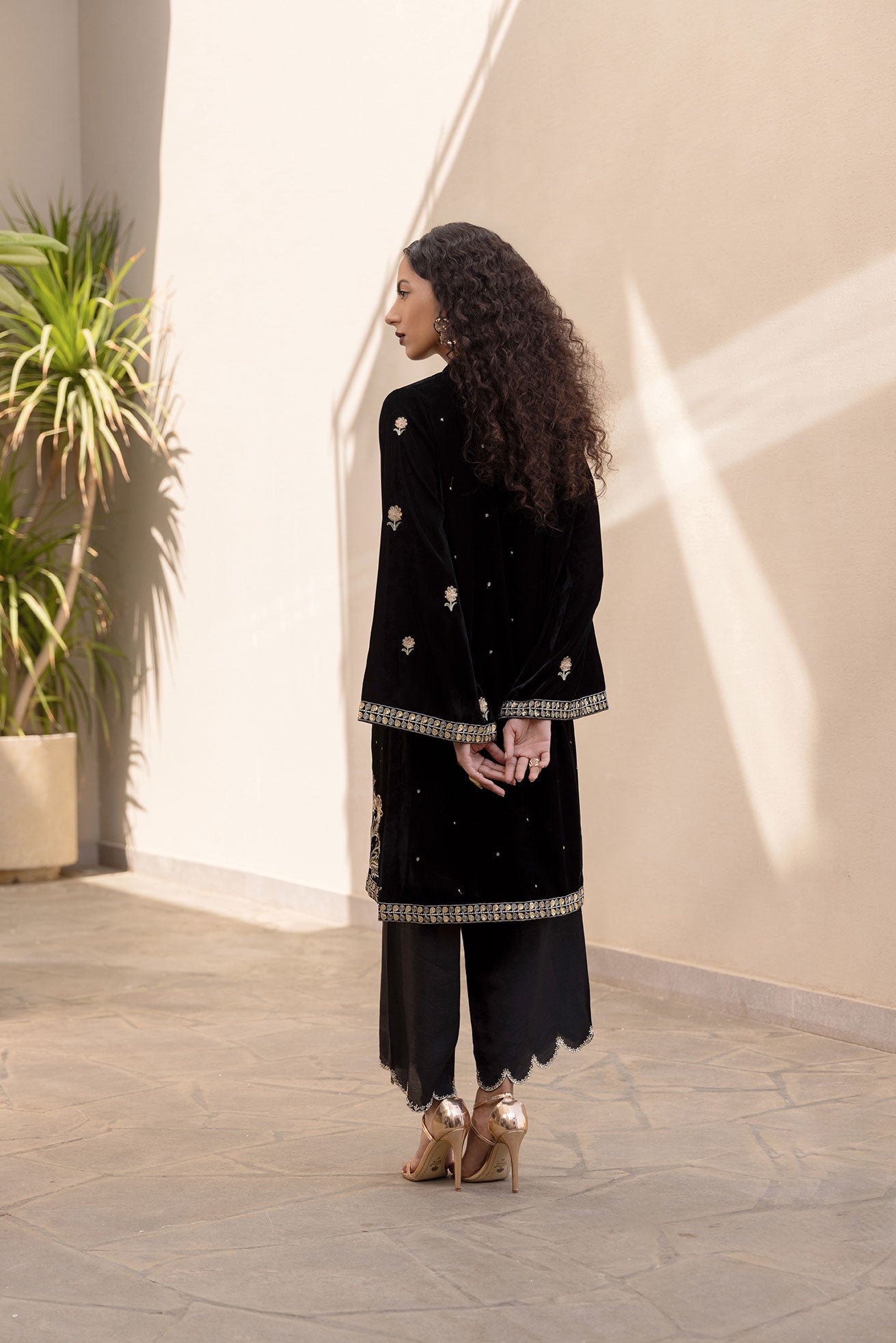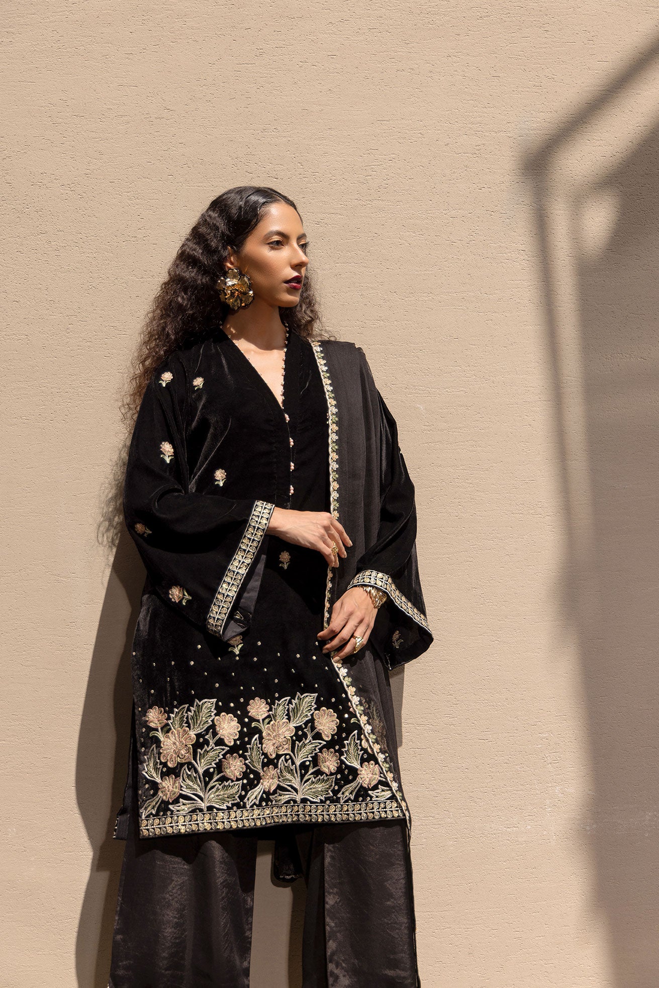 Exude grace with Dhanak's Velvet RTW Edit. This black velvet two-piece ensemble features a finely embroidered kurta, adorned with delicate floral motifs and highlighted by pearl embellishments around the elegant V-neckline. The floral embroidery on the daman is accentuated with intricate embellishments, adding a touch of luxury. Paired with raw silk embroidered pants, this outfit is a perfect harmony of sophistication and charm, ideal for festive and formal occasions.