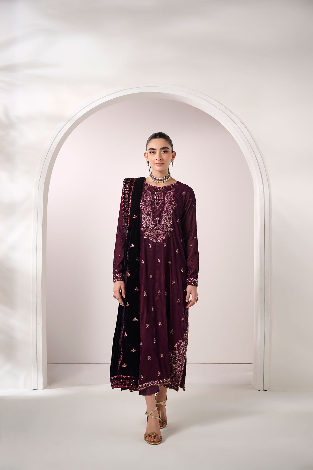 Exude sophistication with this stunning two-piece velvet ensemble in a deep, regal purple. The kurta is heavily embroidered with intricate detailing, creating a captivating contrast, adding an air of elegance and opulence. Paired with plain trousers, this set masterfully balances lavish embroidery with understated style, making it an ideal choice for festive occasions and formal gatherings.