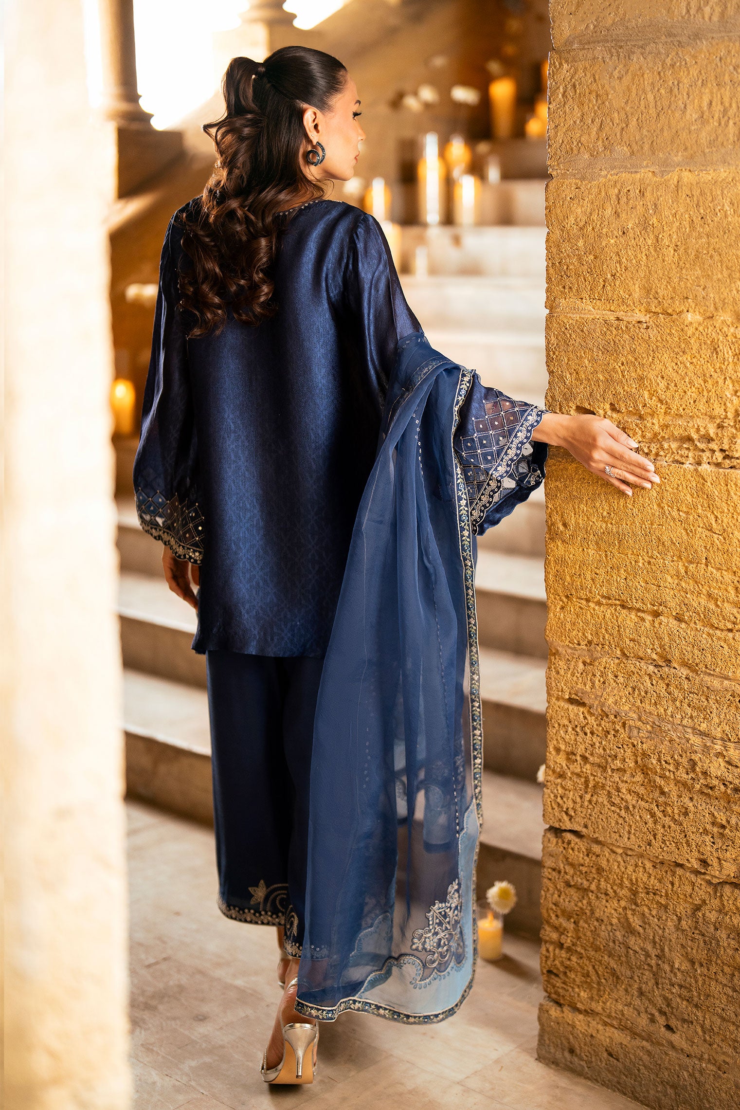 A three-piece luxury ready-to-wear from Dhanak’s Lumière Collection in a deep navy blue hue. The fluid shirt is adorned with intricate embroidery along the neckline, sleeves, and hem, creating a refined yet striking silhouette. Paired with straight-cut trousers and a sheer dupatta, this ensemble is ideal for elevated evening wear, reflecting Lumière’s signature of timeless, detail-driven luxury.