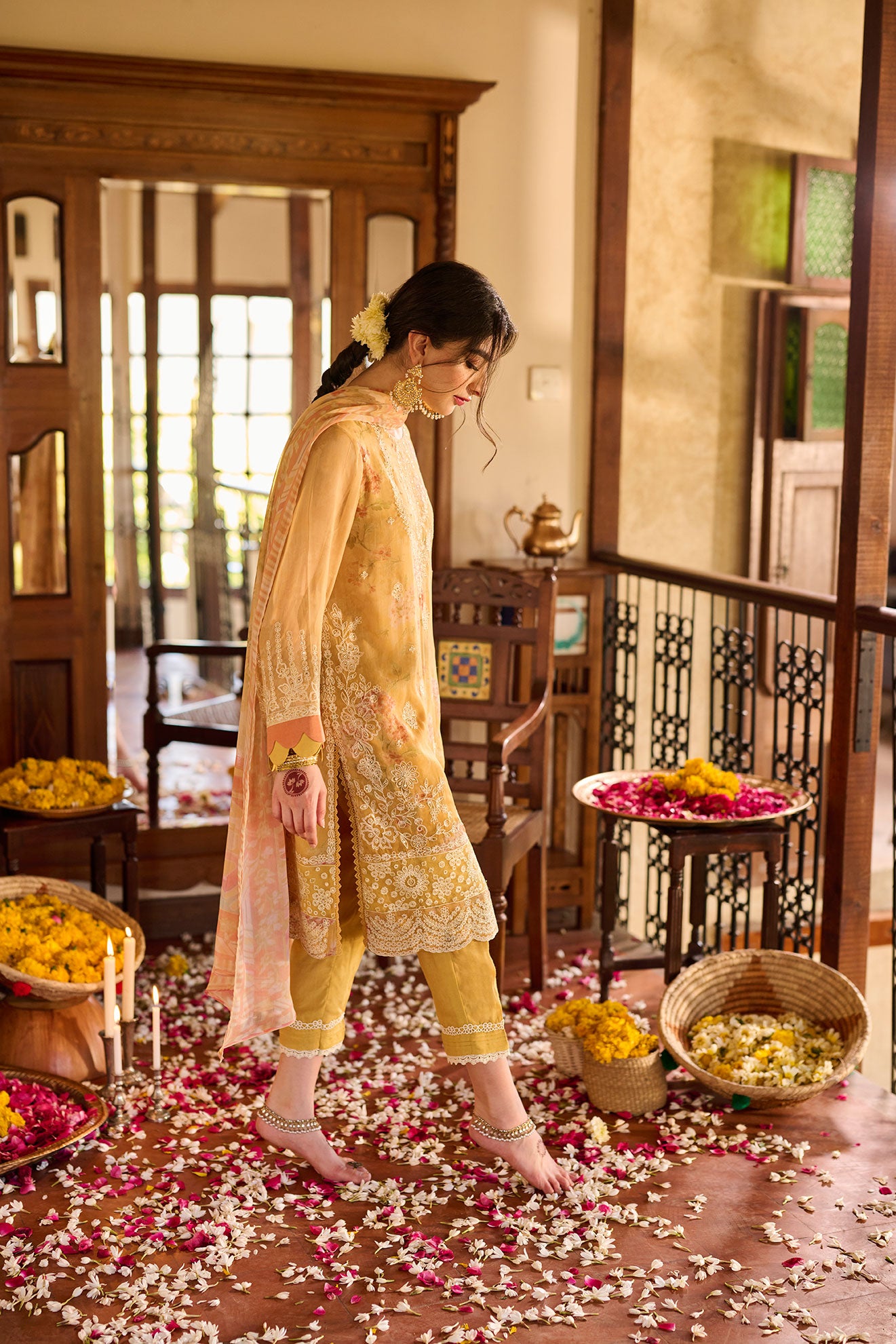 Set against the serene off-white canvas, provides a canvas for the delicate blue embroidery, creating an enchanting ensemble. The timeless silhouette of the kurta pairs seamlessly with the tailored trousers, ensuring both comfort and style for your festive occasions. Make a captivating entrance this Eid with this enchanting ensemble, perfect for embracing the spirit of celebration with sophistication and poise.