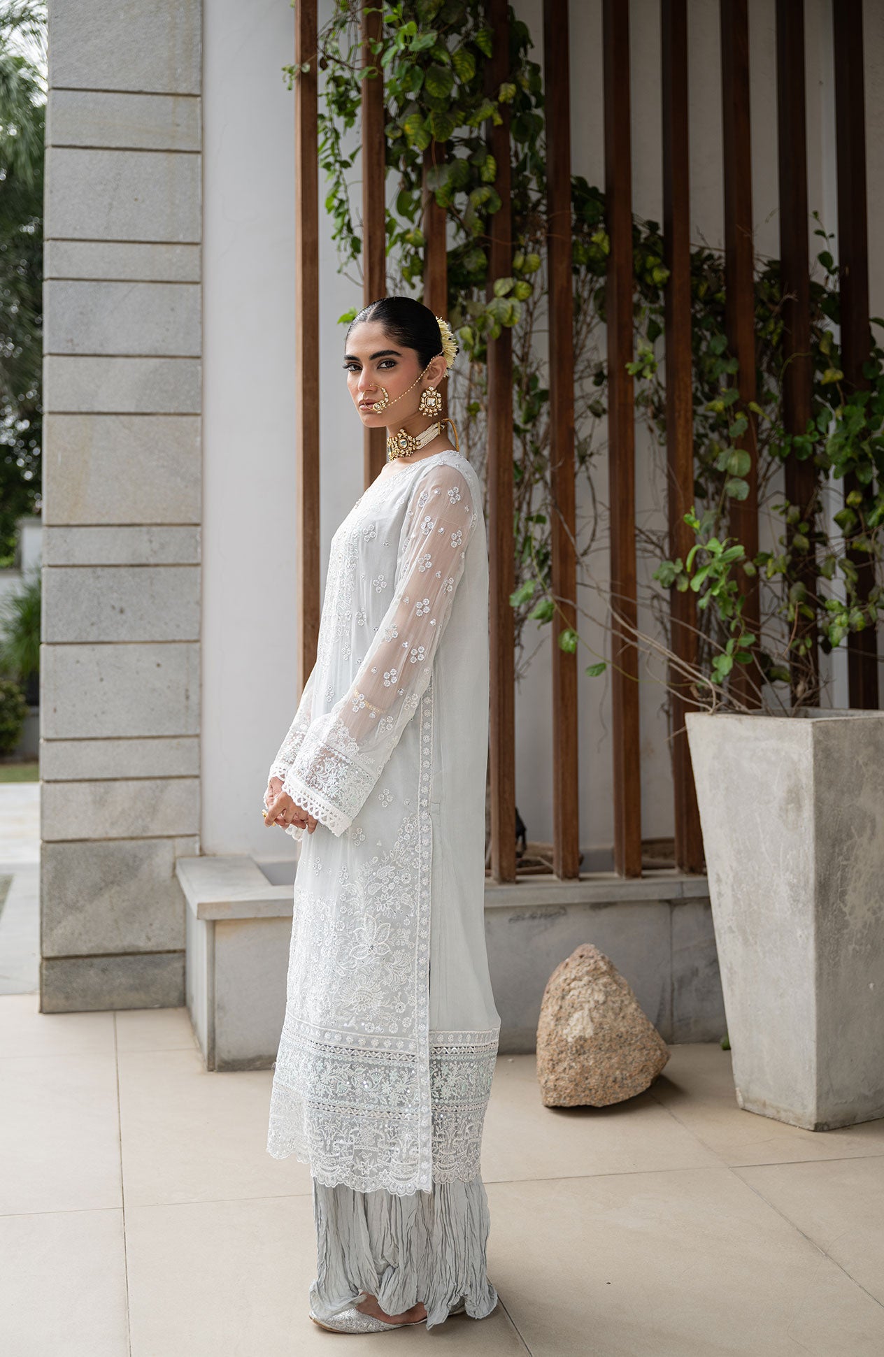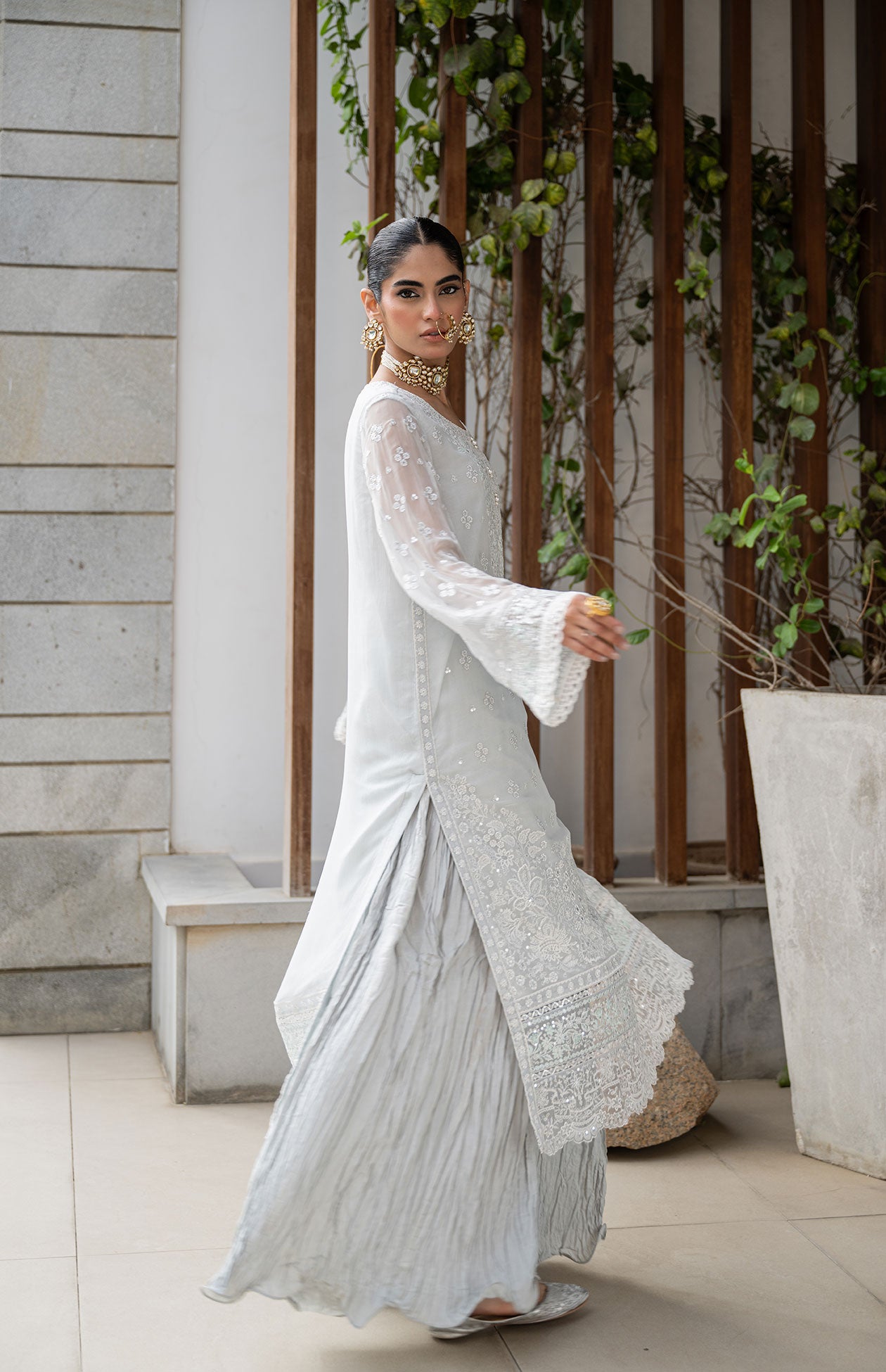 Featuring a pristine white chiffon embroidered straight kurta, perfectly paired with stylish crushed pants, this ensemble creates a sophisticated and timeless look ideal for festive celebrations.