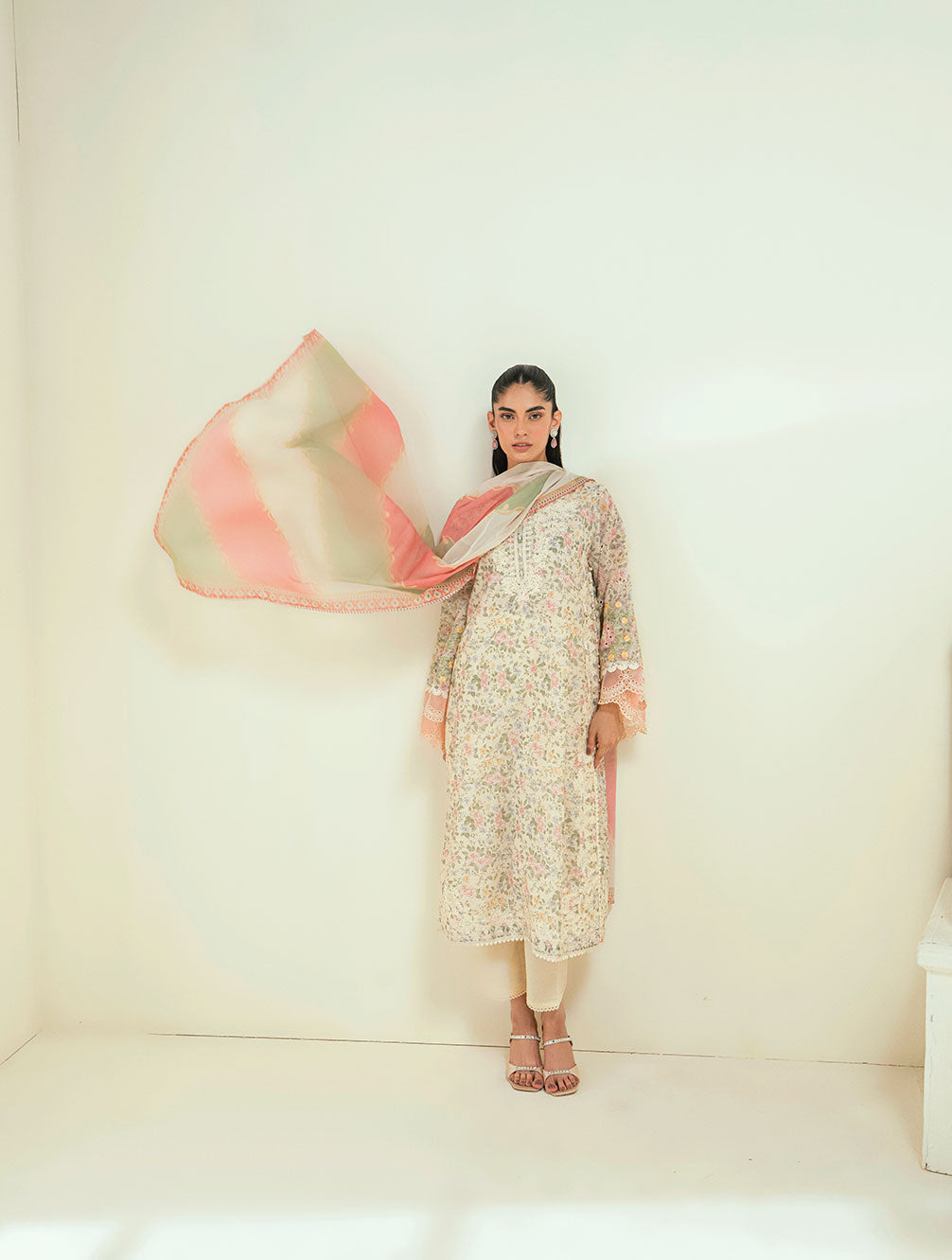 This elegant two-piece set features a long kurta adorned with a delicate floral print, beautifully accentuated with embroidered laces for a touch of timeless charm. The design strikes the perfect balance between soft femininity and everyday sophistication. Paired with solid straight pants, the look is effortlessly graceful, ideal for both casual and semi-formal gathering