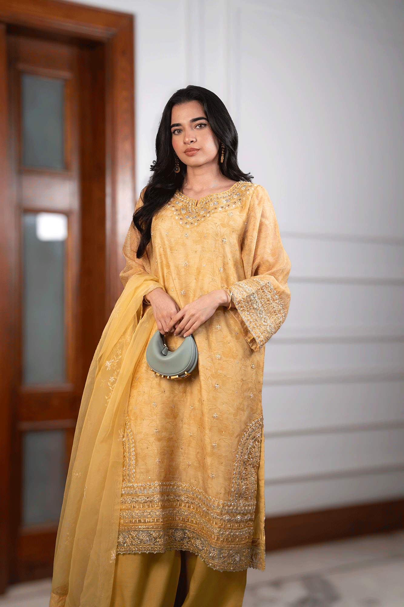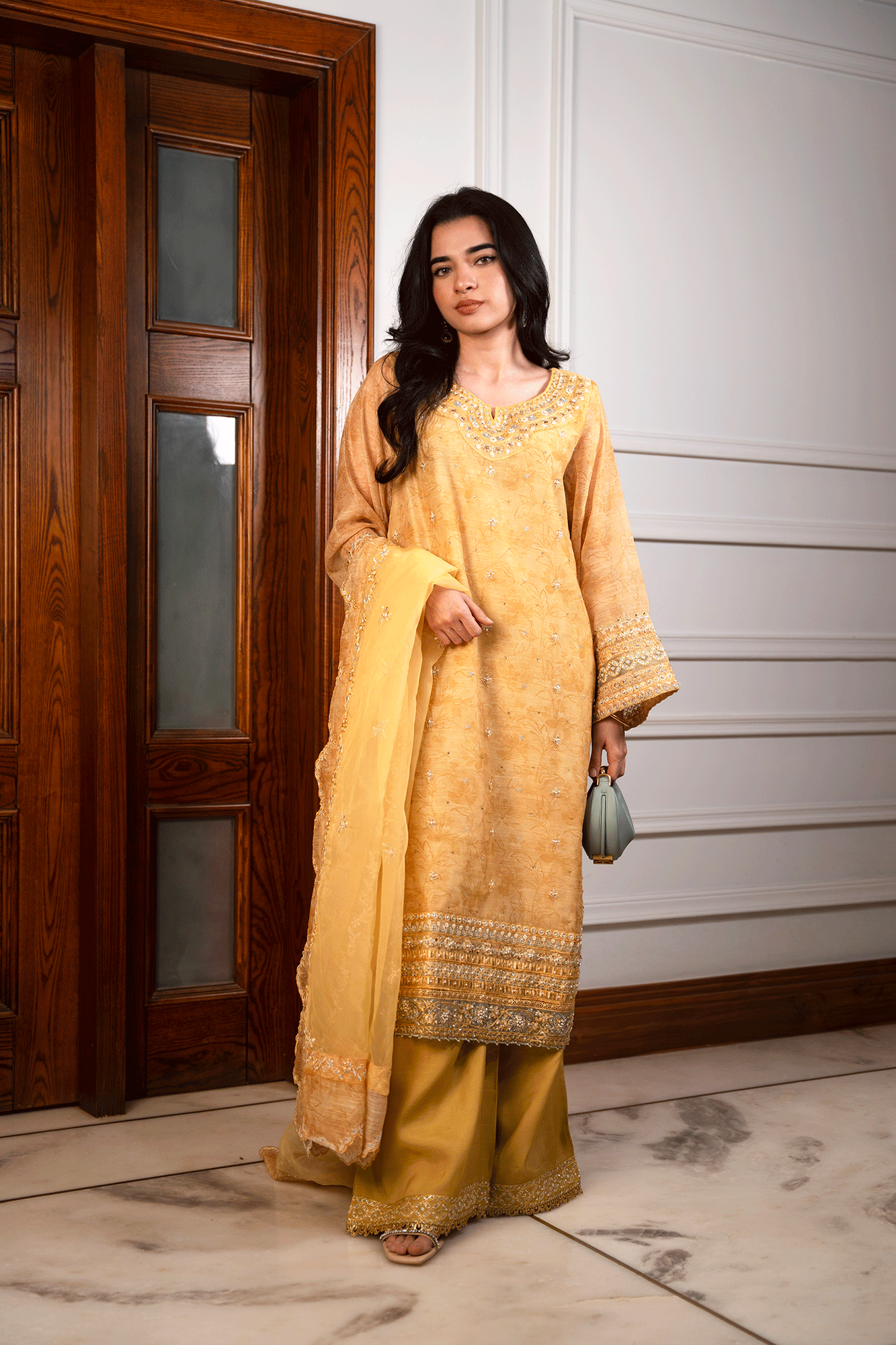 Update your festive wardrobe with this radiant mustard three-piece ensemble. The embroidered shirt, highlighted with intricate detailing and embellishments, exudes elegance and charm. Paired with a graceful embroidered dupatta and flowy embroidered palazzos, this outfit combines traditional artistry with contemporary flair, making it a perfect choice for any celebratory occasion.