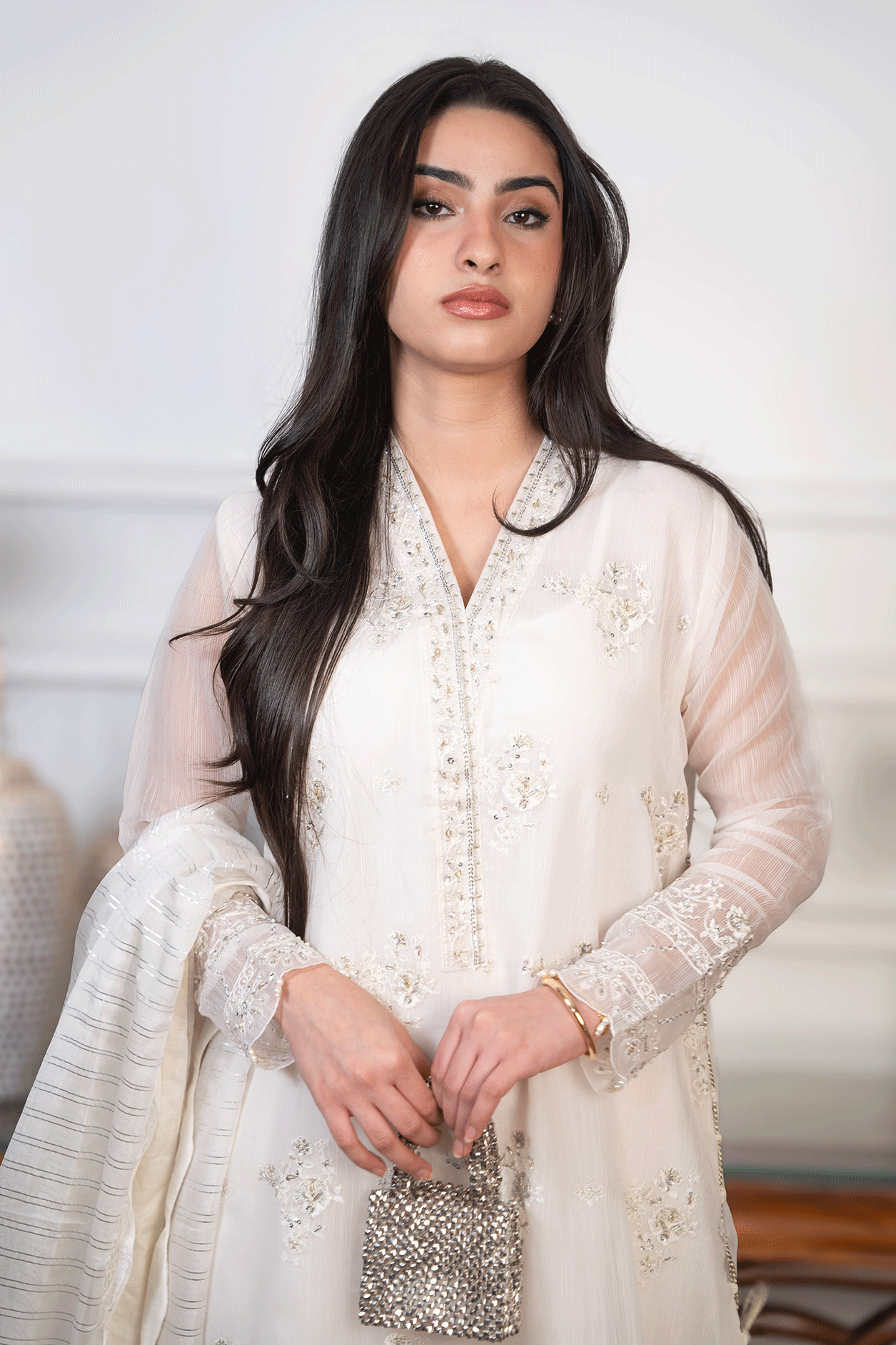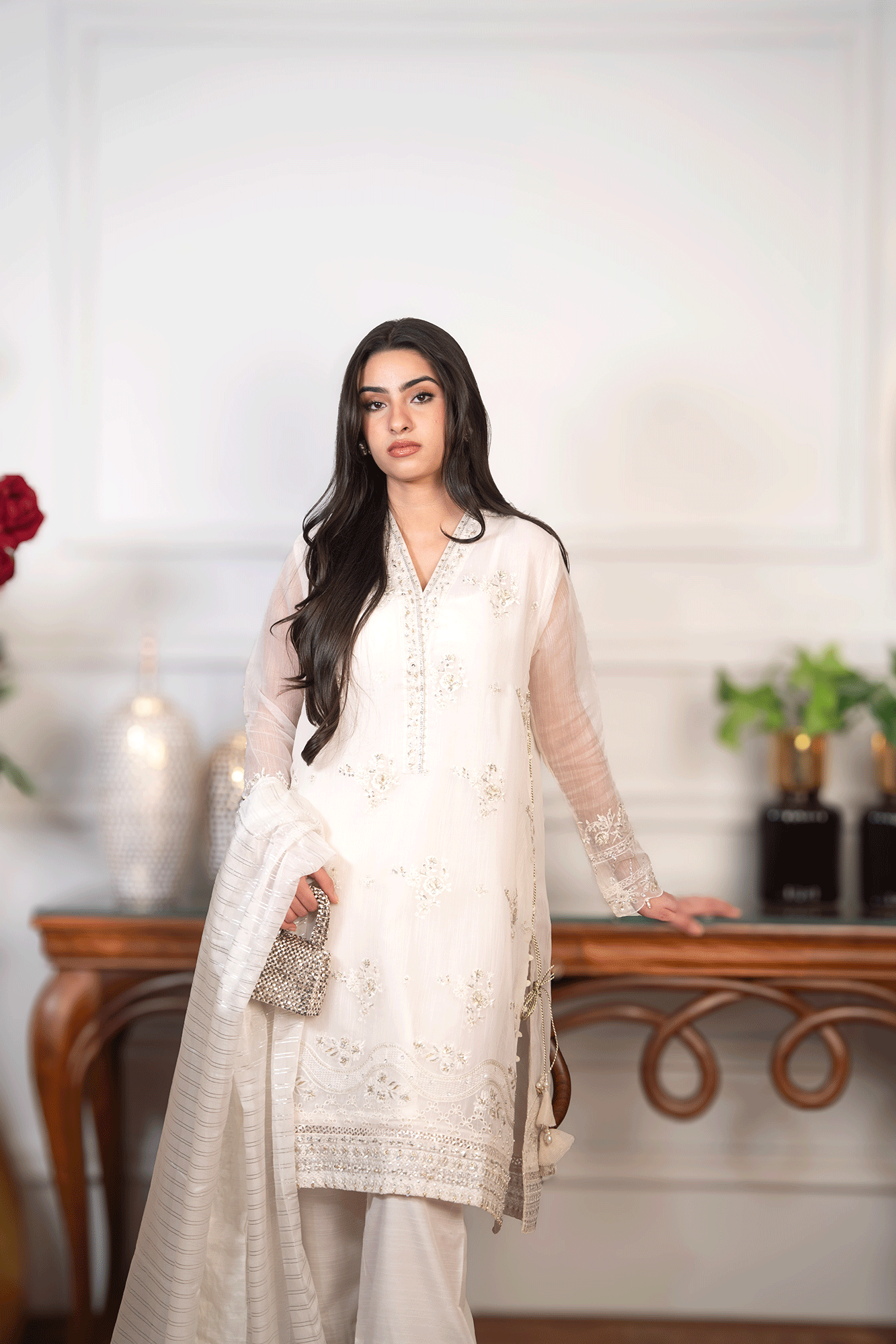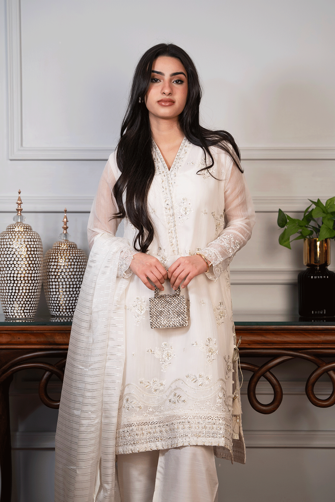 This white three-piece ensemble, crafted from organza stripe fabric, is a stunning display of craftsmanship. It features delicate embroidery and intricate dori detailing along the side panels, adding a refined touch of elegance. Paired with an embroidered trouser and matching dupatta, this outfit exudes sophistication and grace, making it the perfect choice for both formal and festive occasions.