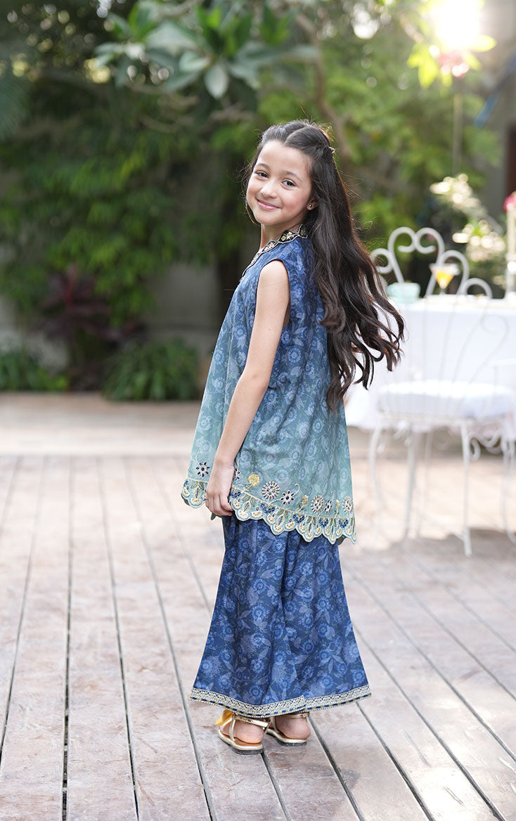 Bright, cheerful, and full of charm — this mini blue silk outfit is designed for little style stars. Decorated with playful yellow floral embroidery and gentle embellishments, the modern-cut shirt is paired with coordinating embroidered bottoms, making it a picture-perfect festive look for your little one to match with mom.