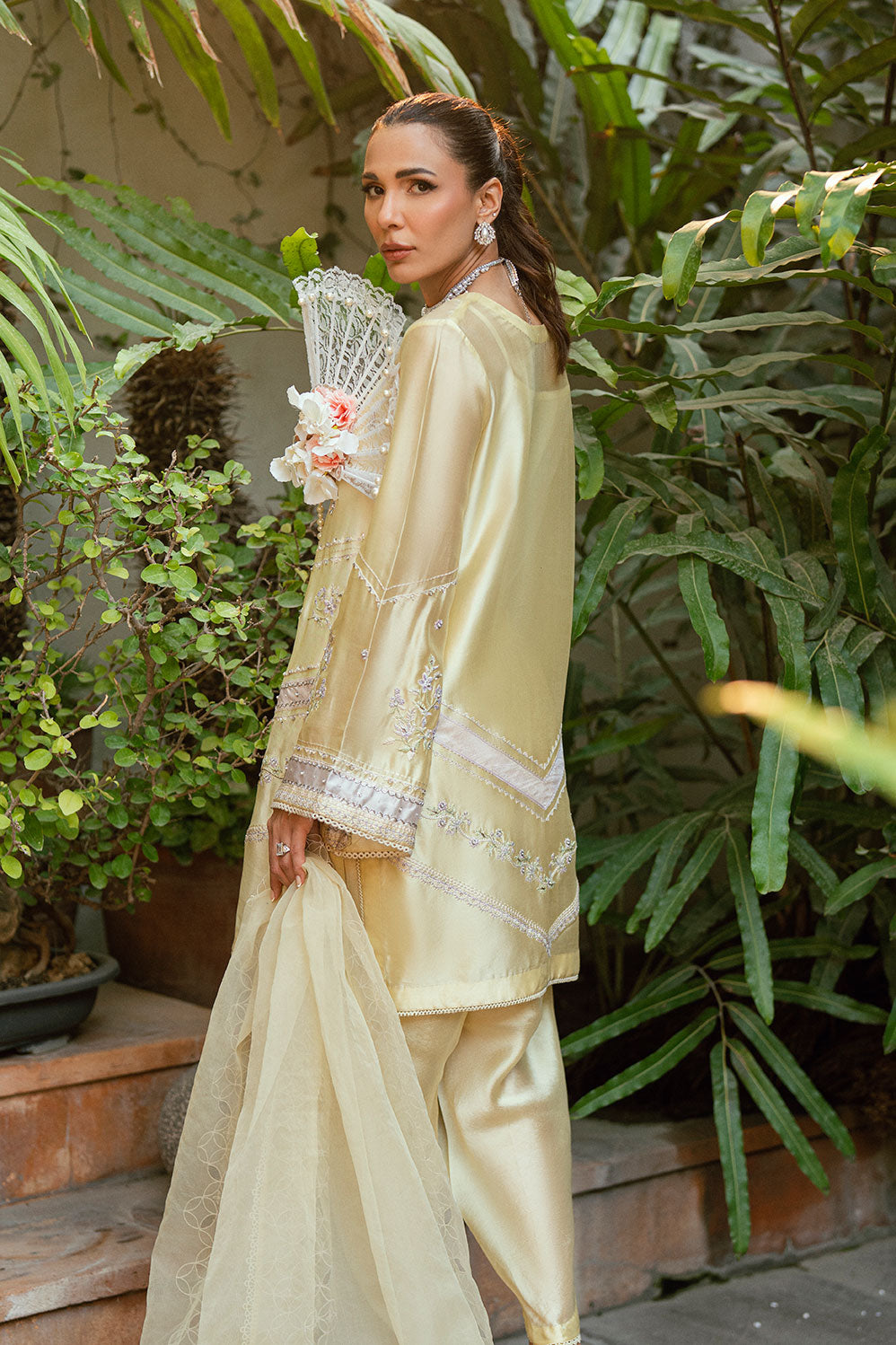 Radiate sunshine in this stunning yellow three-piece ensemble by Dhanak. Designed on luxe sheesha silk fabric, the shirt features intricate embroidery and delicate embellishments that exude timeless charm. Paired with embroidered raw silk tulip pants and a coordinating dupatta, this outfit blends festive flair with refined elegance.